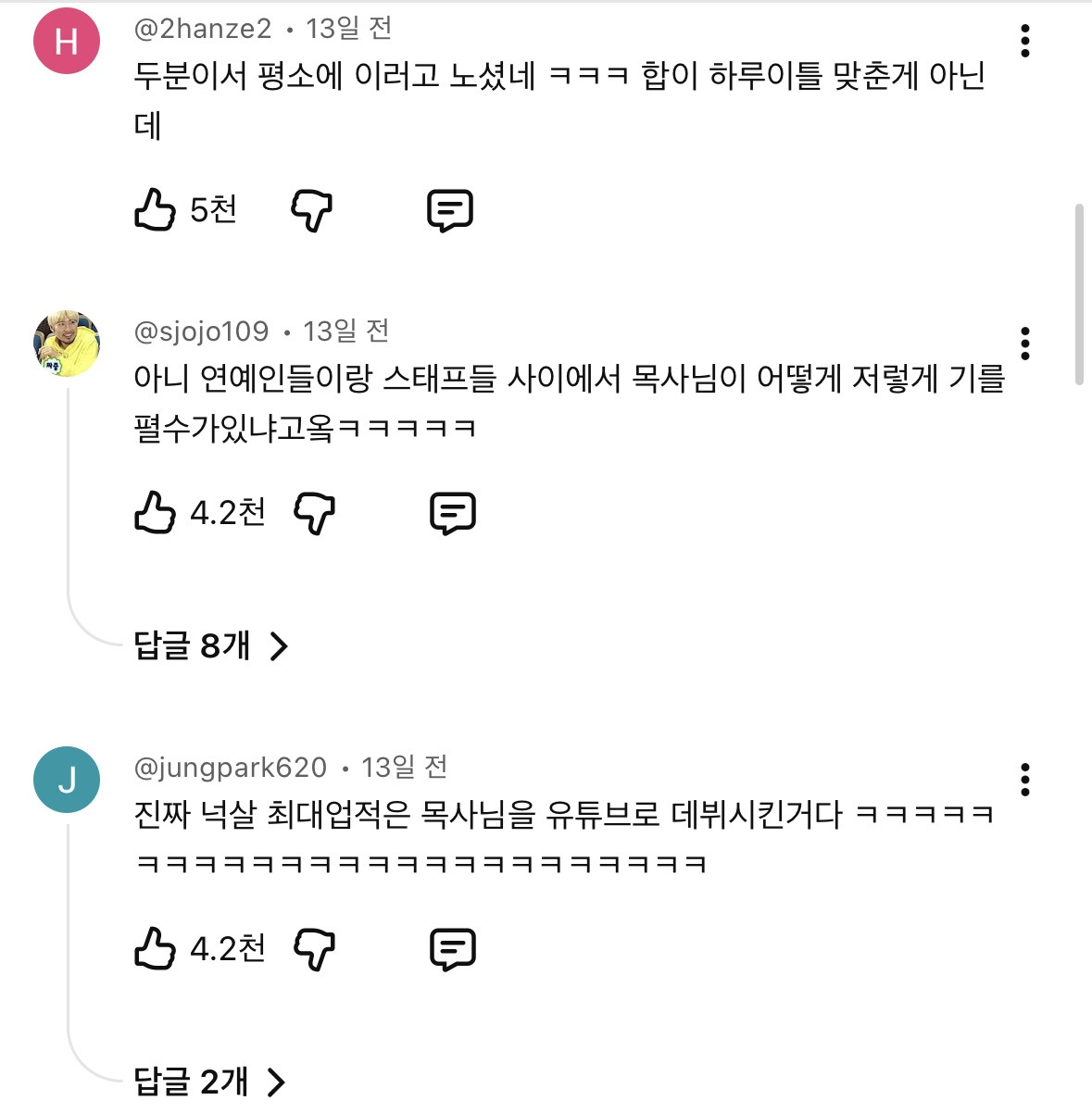[흥미돋]뭔가 홀리한 장항준 김은희 부부 느낌있다는 넉살 유튜브 목사 부부 작성자오가닉제품|작성시간26.03.05|조회수26,346 목록 댓글 19 글자크기 작게가 글자크기 크게가 출처: https://theqoo.net/square/4115254936https://youtube.com/shorts/34LBa5ndga8 다음검색 현재 게시글 추가 기능 열기 북마크 공유하기 신고 센터로 신고 댓글 댓글 19 댓글쓰기 답글쓰기 댓글 리스트 작성자느집엔이거없지 | 작성시간 26.03.05 맨날 기도시키는것도 웃겨 작성자버터장조림듬뿍김밥 | 작성시간 26.03.05 목사님 왕년에 워십좀뛰어봤나본뎈ㅋㅋㅋㅋㅋㅋㅋㅋ 작성자될일될 | 작성시간 26.03.05 넉살은 어캐 목사님이랑 친구인거임?? ㄹㅇ 동네친구인거?? 답댓글 작성자밀면안돼 | 작성시간 26.03.05 어릴때부터 친구래 ㄹㅇ 찐친ㅋㅋㅋㅋ 작성자아침마당빰빠 | 작성시간 26.03.05 원래 저래 그냥이 개웃김 ㅋㅋㅋ 댓글 전체보기