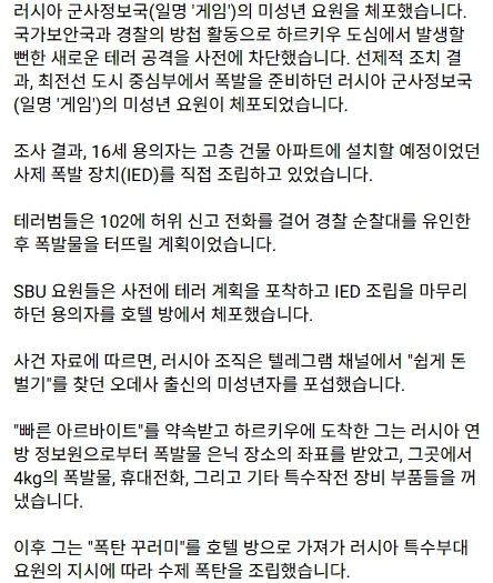 쉽고 빠른 아르바이트를 찾는 우크라이나 청소년을 꼬드겨서 폭탄 테러 시키려다가 적발..