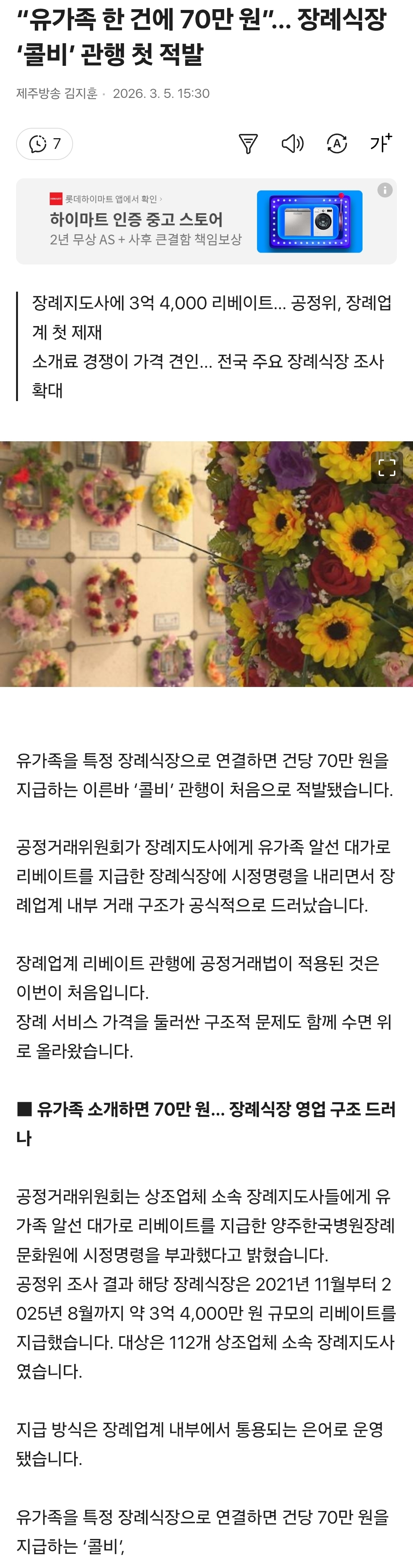 [여시뉴스데스크]“유가족 한 건에 70만 원”… 장례식장 ‘콜비’ 관행 첫 적발 작성자검동이|작성시간26.03.05|조회수8,837 목록 댓글 3 글자크기 작게가 글자크기 크게가 출처: https://v.daum.net/v/20260305153003436 ... 전문은 출처로.. 다음검색 현재 게시글 추가 기능 열기 북마크 공유하기 신고 센터로 신고 댓글 댓글 3 댓글쓰기 답글쓰기 댓글 리스트 작성자에혀피곤하다 | 작성시간 26.03.05 와 개쩐다 작성자뽁떵이 | 작성시간 26.03.05 와 작성자Ji eun | 작성시간 26.03.05 스드메도 그러구 소개비 댓글 전체보기
