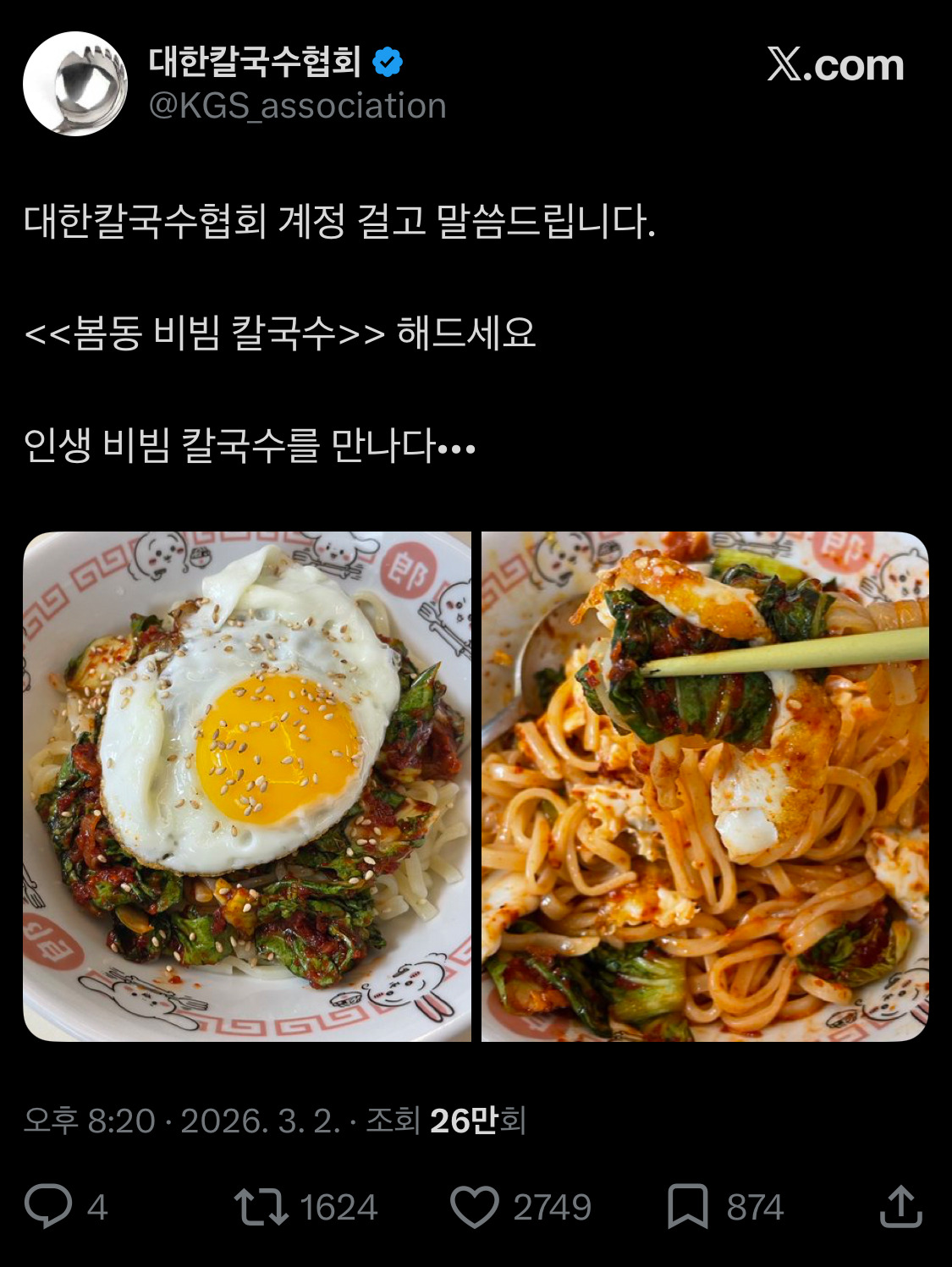 [흥미돋]대한칼국수협회 계정 걸고 말씀드립니다. <<봄동 비빔 칼국수>> 해드세요 작성자커피캡슐|작성시간26.03.05|조회수17,182 목록 댓글 20 글자크기 작게가 글자크기 크게가 출처: https://x.com/kgs_association/status/2028430352734457883 다음검색 현재 게시글 추가 기능 열기 북마크 공유하기 신고 센터로 신고 댓글 댓글 20 댓글쓰기 답글쓰기 댓글 리스트 답댓글 작성자마싯는시밤바 | 작성시간 26.03.06 ㅈㅈㅈ진수맛궁금해허니 버터헤드가 드레스한거 말한 거 맞거든???ㅋㅋ소근소근말해줘서 ㄱㅅㄱㅅㅋㅋㅋ 작성자블루랜턴 | 작성시간 26.03.05 난 메밀면으로 했음 개존맛임 작성자이게 뭐노?? | 작성시간 26.03.05 칼국수면따위 없다 소면으로 해야지.. 작성자안감사함 | 작성시간 26.03.05 하 진짜 쩝쩝박사들 작성자마법사할로윈 | 작성시간 26.03.05 진짜 이럴때마다 학벌 박탈감 들어 댓글 전체보기