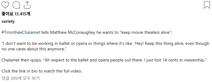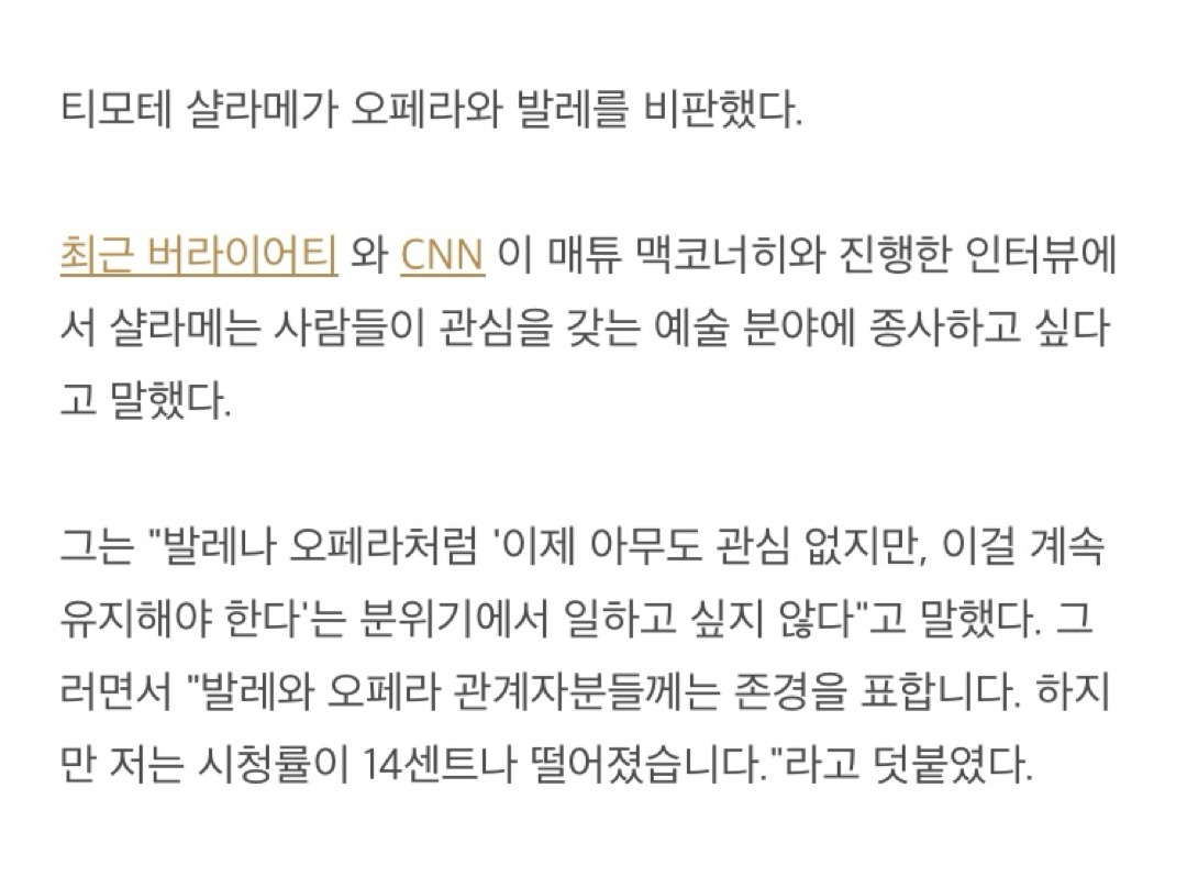 [흥미돋]또 망언해서 반응 난리난 티모시 샬라메.jpg 작성자귤토끼이|작성시간26.03.05|조회수21,786 목록 댓글 60 글자크기 작게가 글자크기 크게가 출처: https://theqoo.net/square/4115704655 https://www.instagram.com/reel/DVJ1oE5iUCK 다음검색 현재 게시글 추가 기능 열기 북마크 공유하기 신고 센터로 신고 댓글 댓글 60 댓글쓰기 답글쓰기 댓글 리스트 작성자두릅티김 | 작성시간 26.03.06 얼굴도 뇌도 맛갓네 작성자내맘 얼어버려도 | 작성시간 26.03.06 ? 쟤한테 관심없고 그런거에 관심많은데 나만 그런가 작성자강쥐고양이사랑해 | 작성시간 26.03.06 돌아이네 작성자땅콩버터는100프로로먹어 | 작성시간 26.03.06 하고싶어도 못해 넌.. 얼마나 많은 재능들과 노력들이 모여서 만들어내는건데 클래식이 왜 클래식이냐 몇백년동안 살아남은게 클래식임 작성자이고고 | 작성시간 26.03.07 넌 안받아줘... 댓글 전체보기