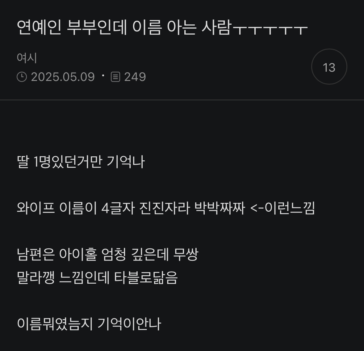[스크랩] [배꼽의행방]연예인 부부인데 이름 아는 사람ㅜㅜㅜㅜ 작성자.•*지9나.볈 려헹 중*•.|작성시간26.03.05|조회수90,966 목록 댓글 13 글자크기 작게가 글자크기 크게가 출처: https://m.cafe.daum.net/subdued20club/Lp0T/168197459모든 이야기의 시작 - Daum 카페모든 이야기의 시작, Daum 카페m.cafe.daum.net정답은 하시시박이라죠 다음검색 스크랩 원문 : *여성시대* 차분한 20대들의 알흠다운 공간 현재 게시글 추가 기능 열기 북마크 공유하기 신고 센터로 신고 댓글 댓글 13 댓글쓰기 답글쓰기 댓글 리스트 작성자재밌다재밌어 | 작성시간 26.03.05 진진자라 박박짜짴ㅋㅋㅋㅋㅋㅋㅋㅋ 작성자체리우정 | 작성시간 26.03.05 봉태규ㅋㅋㅋㅋㅋㅋㅋㅋㅋ 가방 인형 들고 다니는 사람이라고 하면 더 빨리 알아 들을듯 작성자Mega | 작성시간 26.03.05 본명이 ㄹㅇ 하시시박이야? 답댓글 작성자.•*지9나.볈 려헹 중*•. 작성자 본인 여부 작성자 | 작성시간 26.03.05 본명은 박원지래 작성자Moleskine | 작성시간 26.03.06 진진자라때문네 다 까먹었어 댓글 전체보기