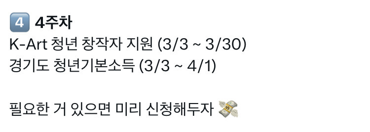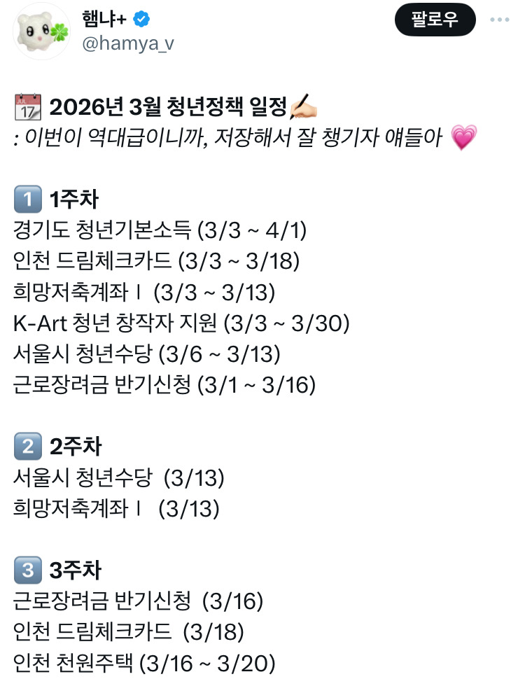 [흥미돋]2026년 3월 청년정책 모음.jpg 작성자Rich|작성시간26.03.05|조회수14,733 목록 댓글 10 글자크기 작게가 글자크기 크게가 출처: https://x.com/hamya_v/status/2029433342035476973?s=46X의 햄냐+님(@hamya_v)📆 2026년 3월 청년정책 일정✍🏻 : 이번이 역대급이니까, 저장해서 잘 챙기자 얘들아 💗 1️⃣ 1주차 경기도 청년기본소득 (3/3 ~ 4/1) 인천 드림체크카드 (3/3 ~ 3/18) 희망저축계좌Ⅰ (3/3 ~ 3/13) K-Art x.com 다음검색 현재 게시글 추가 기능 열기 북마크 공유하기 신고 센터로 신고 댓글 댓글 10 댓글쓰기 답글쓰기 댓글 리스트 작성자로제납쟉당면 | 작성시간 26.03.06 고마워! 작성자이츠실제상황 | 작성시간 26.03.06 감사합니덩 작성자우리앞으로더사랑하자 | 작성시간 26.03.06 몰랐던게 많네 고마워! 작성자와이라노사우루스 | 작성시간 26.03.06 고마워!!! 작성자초코큐키젤리 | 작성시간 26.03.08 고마워 댓글 전체보기