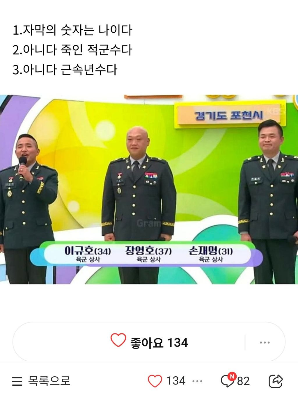 [흥미돋]전국 노래자랑 미스테리 작성자flflf|작성시간26.03.06|조회수15,840 목록 댓글 23 글자크기 작게가 글자크기 크게가 출처: 여성시대 flflf 다음검색 현재 게시글 추가 기능 열기 북마크 공유하기 신고 센터로 신고 댓글 댓글 23 댓글쓰기 답글쓰기 댓글 리스트 작성자우리언니그런사람아니다 | 작성시간 26.03.06 답이 뭔데 작성자진라면 약간매운맛 | 작성시간 26.03.06 근속년수랍니다 작성자박력분 | 작성시간 26.03.06 죽인 적군의 숫자래 ㅋㅋㅋㅋㅋㅋㅋ 개웃기네 ㅋㅋㅋㅋㅋ 작성자말랑말랑한말랑이 | 작성시간 26.03.06 근속년수가 확실하다 작성자R=VD 술술잘풀리기 | 작성시간 26.03.06 이규호는 그나마 그래보이는데 나머지는...? 댓글 전체보기