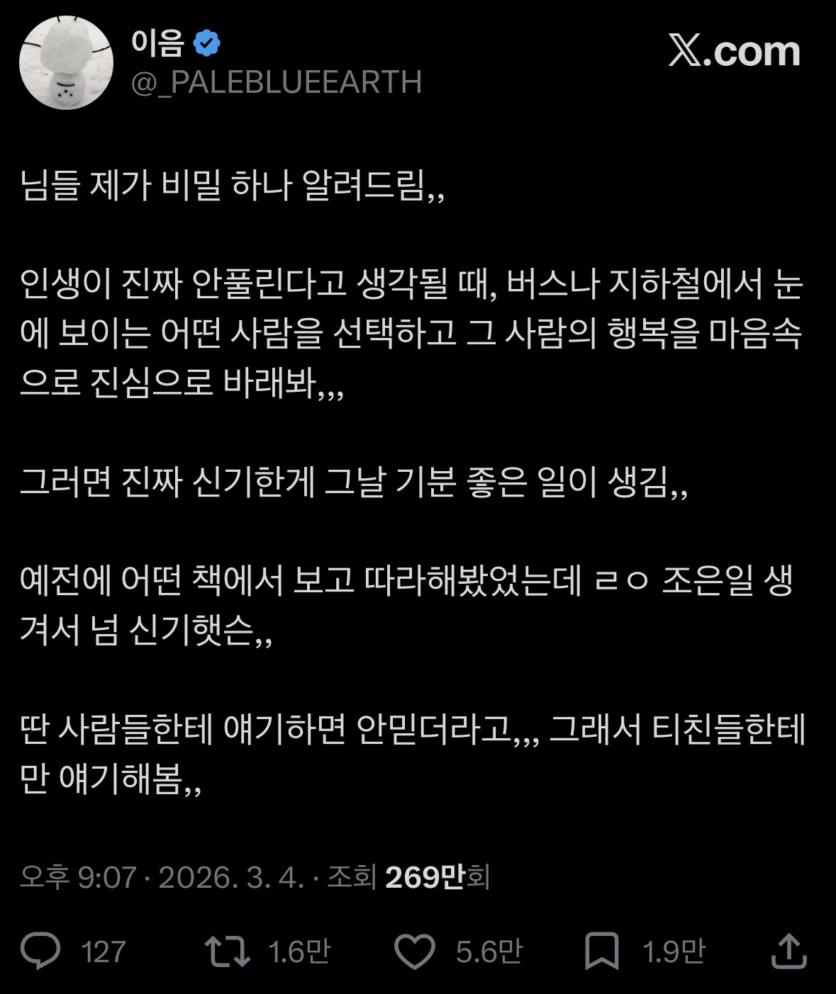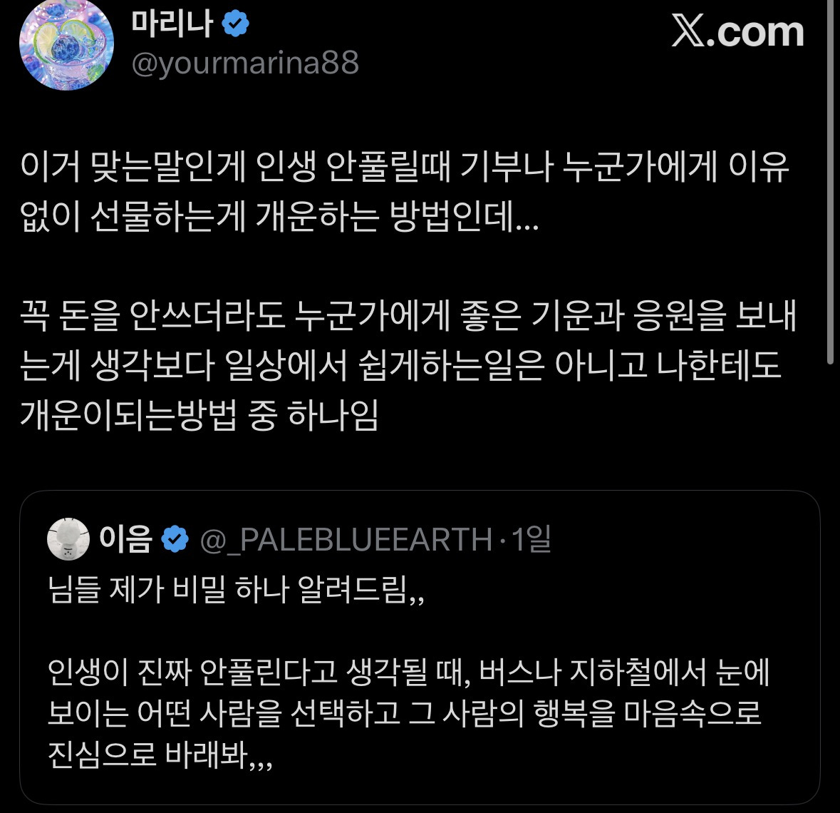 *여성시대* 차분한 20대들의 알흠다운 공간 [흥미돋]인생 안풀릴때 푸는 비법.x 작성시간26.03.06|조회수18,568 목록 댓글 35 글자크기 작게가 글자크기 크게가 출처: https://x.com/yourmarina88/status/2029474649797726343?s=46X의 마리나님(@yourmarina88)이거 맞는말인게 인생 안풀릴때 기부나 누군가에게 이유없이 선물하는게 개운하는 방법인데… 꼭 돈을 안쓰더라도 누군가에게 좋은 기운과 응원을 보내는게 생각보다 일상에서 쉽게하는일은 x.com 다음검색 현재 게시글 추가 기능 열기 북마크 공유하기 신고 센터로 신고 댓글 35 댓글 리스트 작성시간 26.03.06 이글을 읽는 여시들에게 마르지않는 행운과 건강이 함께하길🍀❤️ 작성시간 26.03.06 착한 여시들 항상 행복하고 기쁜 일들만 가득하길🥰 작성시간 26.03.06 그래서 내가 어찌어찌 인생이 풀리는건가 작성시간 26.03.12 맞는말 작성시간 26.03.12 멋지다 카페 방문해 더 많은 댓글 만나기!