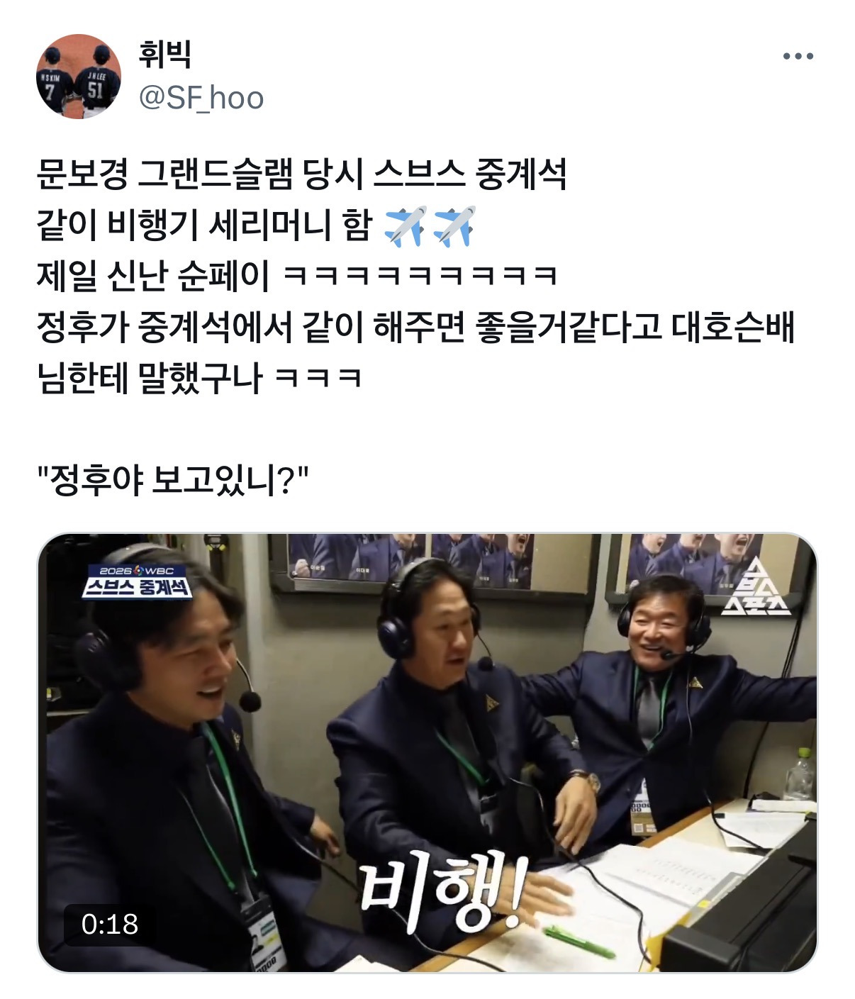 심지어 중계석에서도 같이 비행 세리모니 했다고 함ㅋㅋㅋㅋ ㄱㅇㄱ
