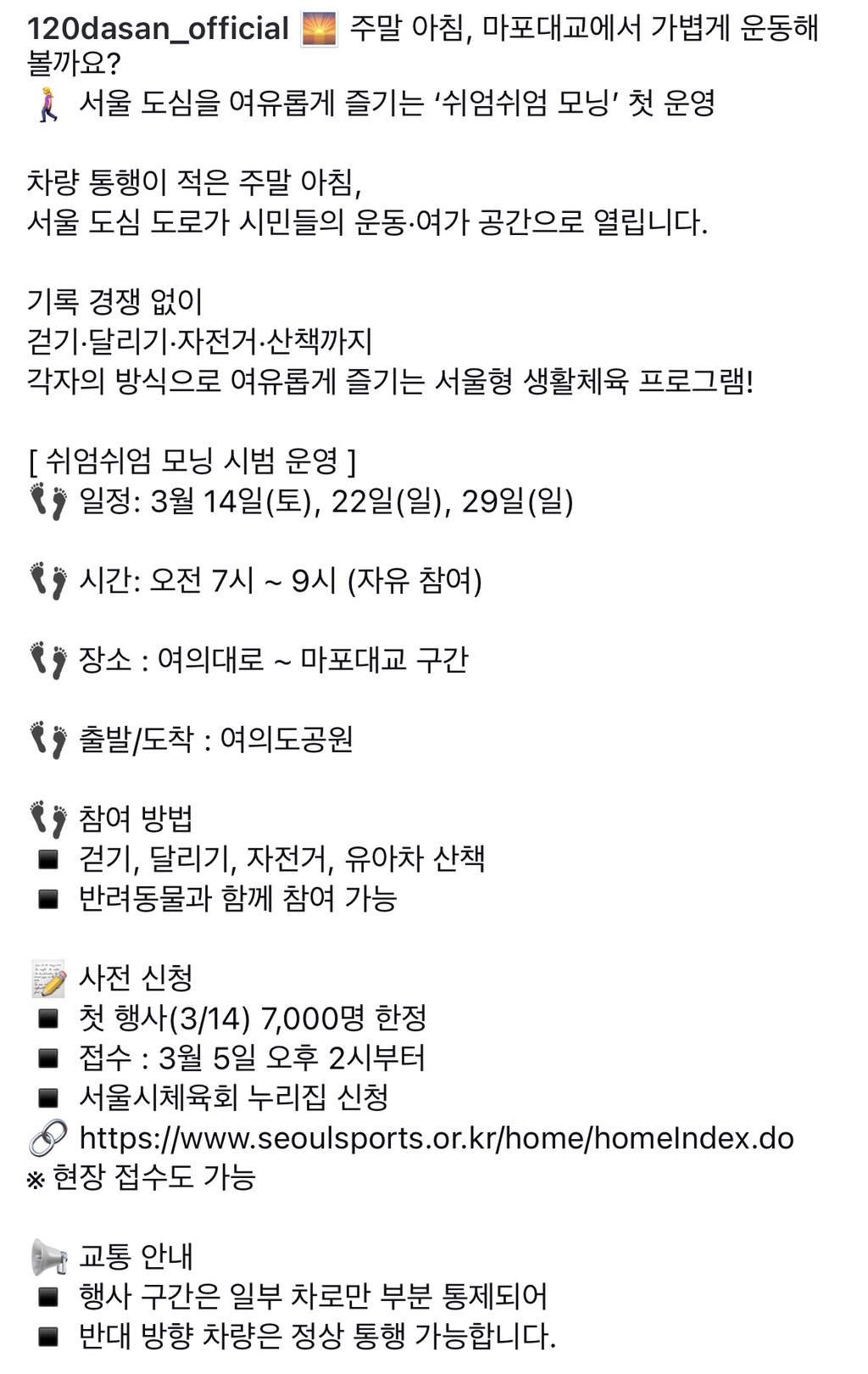 [기타]결국 3월부터 시범운영한다는 서울시 정책ㄷㄷㄷ 작성자십육초|작성시간26.03.07|조회수38,307 목록 댓글 49 글자크기 작게가 글자크기 크게가 출처: 여성시대 십육초-요약-시간대 : 주말 오전 7시-9시구간 : 여의대로~마포대교 5km 전면통제x 일부통제일정/인원 :3.14(토) 22(일) 29(일) / 첫 행사 7천명 한정 사전신청참가방법 : 내 맘대로 참고로 반려동물 자전거 킥보드 달리기 걷기 유모차 모두 가능*대회 형태 아님 다음검색 현재 게시글 추가 기능 열기 북마크 공유하기 신고 센터로 신고 댓글 댓글 49 댓글쓰기 답글쓰기 댓글 리스트 작성자왠 아니고 ㅣ웬ㅣ고슴도치 | 작성시간 26.03.07 뚜벅이인데도 굳이 싶어요,, 작성자이해가 안돼 | 작성시간 26.03.07 주말에도 출근하는 사람어쩌냐...와... 작성자chromee | 작성시간 26.03.08 굳이? 도로를? 작성자폭식코알라 | 작성시간 26.03.08 아니.. 저기 우리집 앞인데요… 안그래도 주말 차 막히는데 왜이러시죠?ㅠㅠ 작성자바밤바비비빅돼지바 | 작성시간 26.03.09 이거 그거 어릴때하던 차없는거리 어른용이네 댓글 전체보기