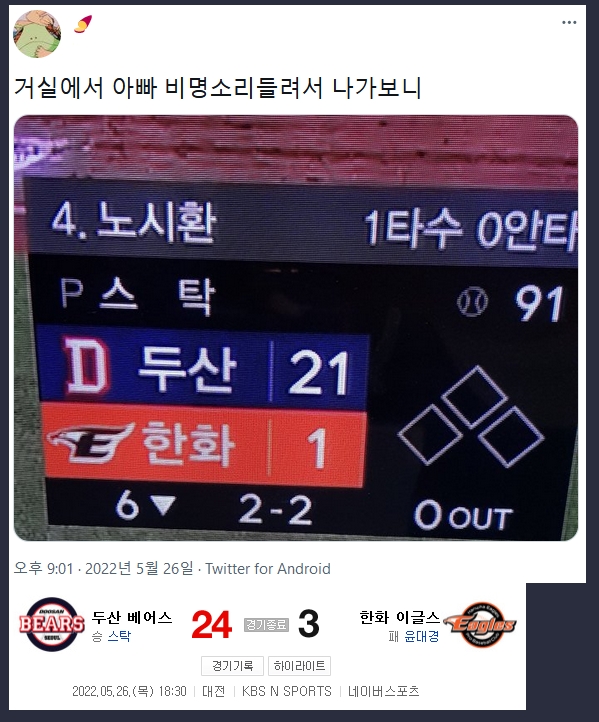 두산 :한화에서 두산이 대승하고