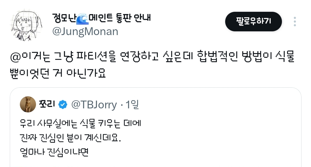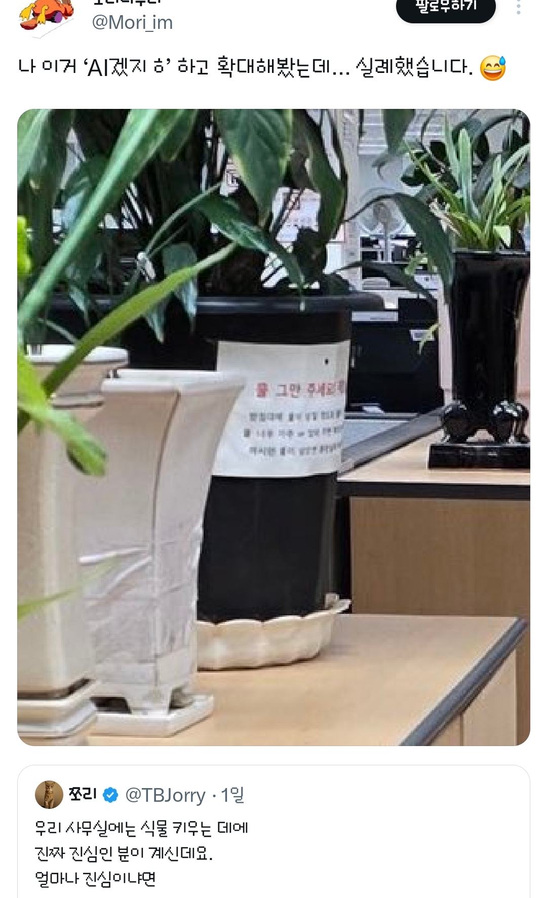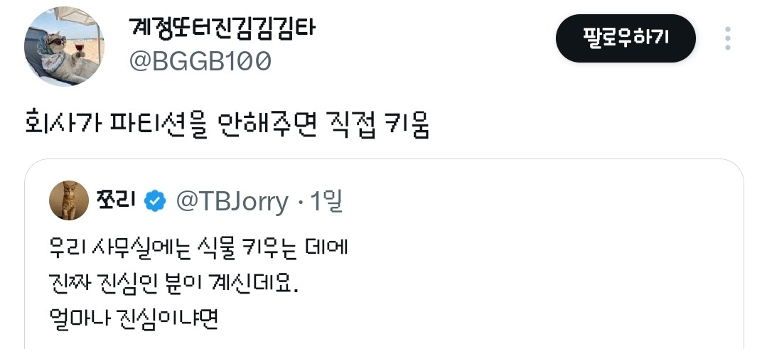 [흥미돋]우리 사무실에는 식물 키우는 데에 진짜 진심인 분이 계신데요.twt 작성자방울|작성시간26.03.07|조회수16,856 목록 댓글 37 글자크기 작게가 글자크기 크게가 출처: 여성시대 방울https://x.com/TBJorry/status/2029729119806837070?t=-FiPxj14yd-WJo0qi_uBfw&s=19대단하다 물 어떻게 다주지?? 다음검색 현재 게시글 추가 기능 열기 북마크 공유하기 신고 센터로 신고 댓글 댓글 37 댓글쓰기 답글쓰기 댓글 리스트 작성자주말은너무짧아요 | 작성시간 26.03.07 식물 키우는 능력이 있는데 사무실에서 일하시다니..저런 인재를 작성자지붕이우주에 | 작성시간 26.03.07 파티션ㅋㅋㅋㅋㅋㅋㅋㅋㅋ 작성자도라방구 | 작성시간 26.03.08 공기정화도 되고 좋겠다 작성자살어떡해 | 작성시간 26.03.08 와 근데 진짜 좋겠다 작성자흐린날이 잠자기 좋아 | 작성시간 26.03.08 이 정도면 물주는게 정말로 노동이잖아 댓글 전체보기
