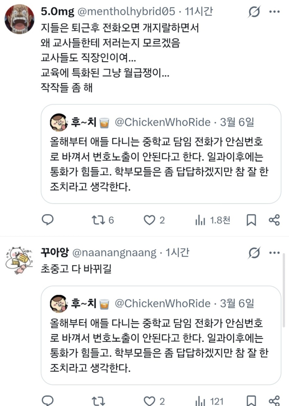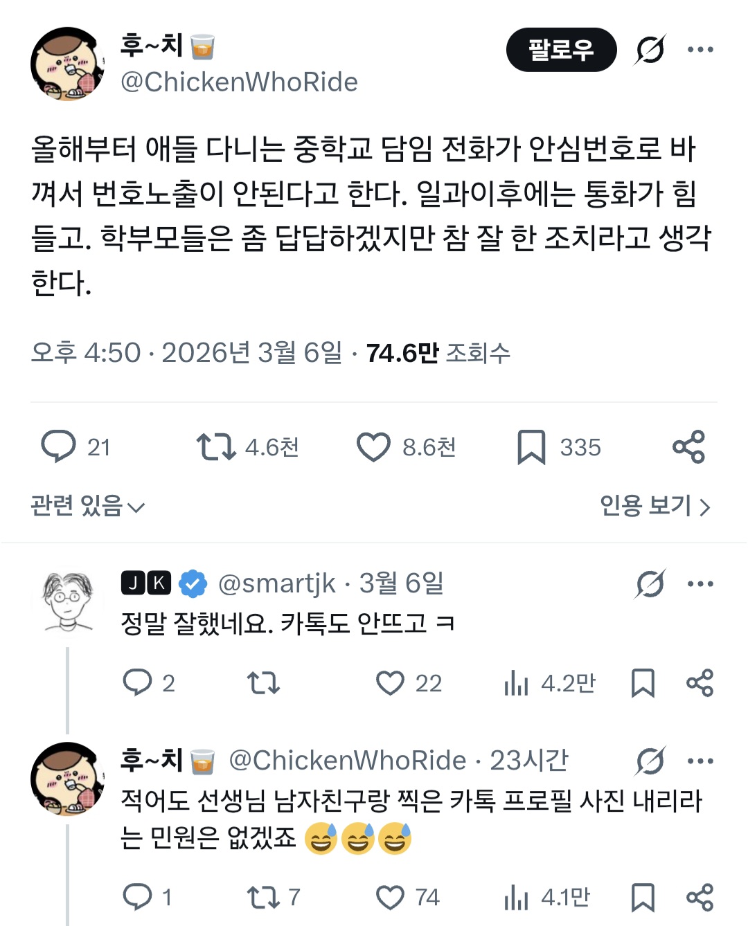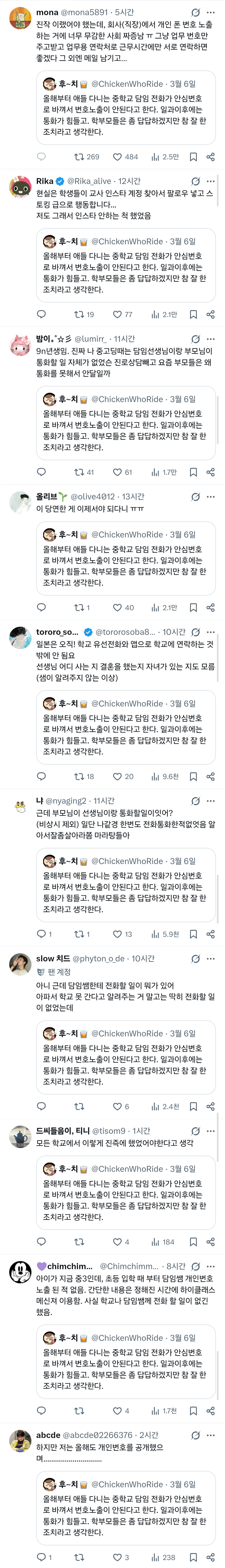 작성자박규리 작성시간 26.03.08 애초에 뭔 일있으면 교무실로 전화해서 몇학년 몇반 담임 찾아서 말했다고요 담임한테 뭔 직접연락이야
