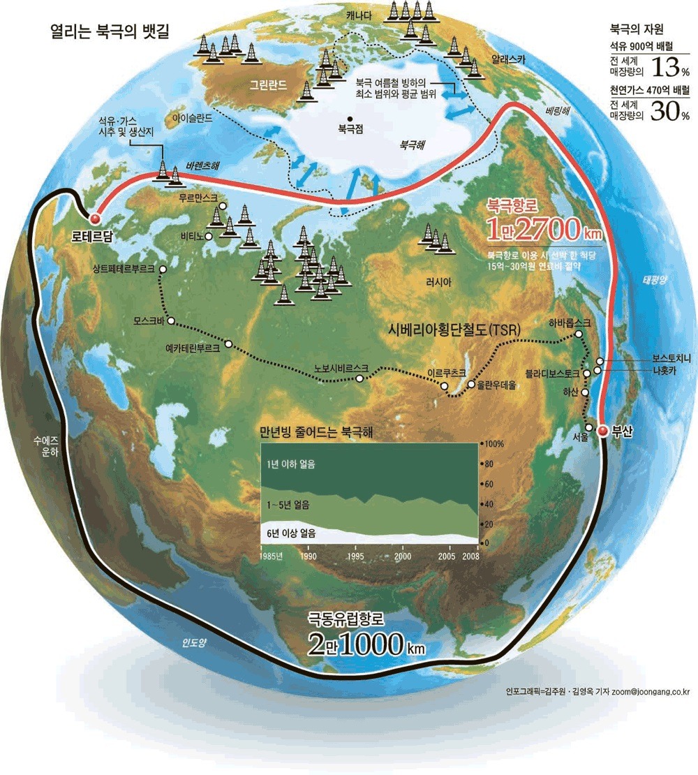 아무튼 그렇기 때문에 각 국은 대응을 강구했고 그 대안이 저 '북극항로'야!