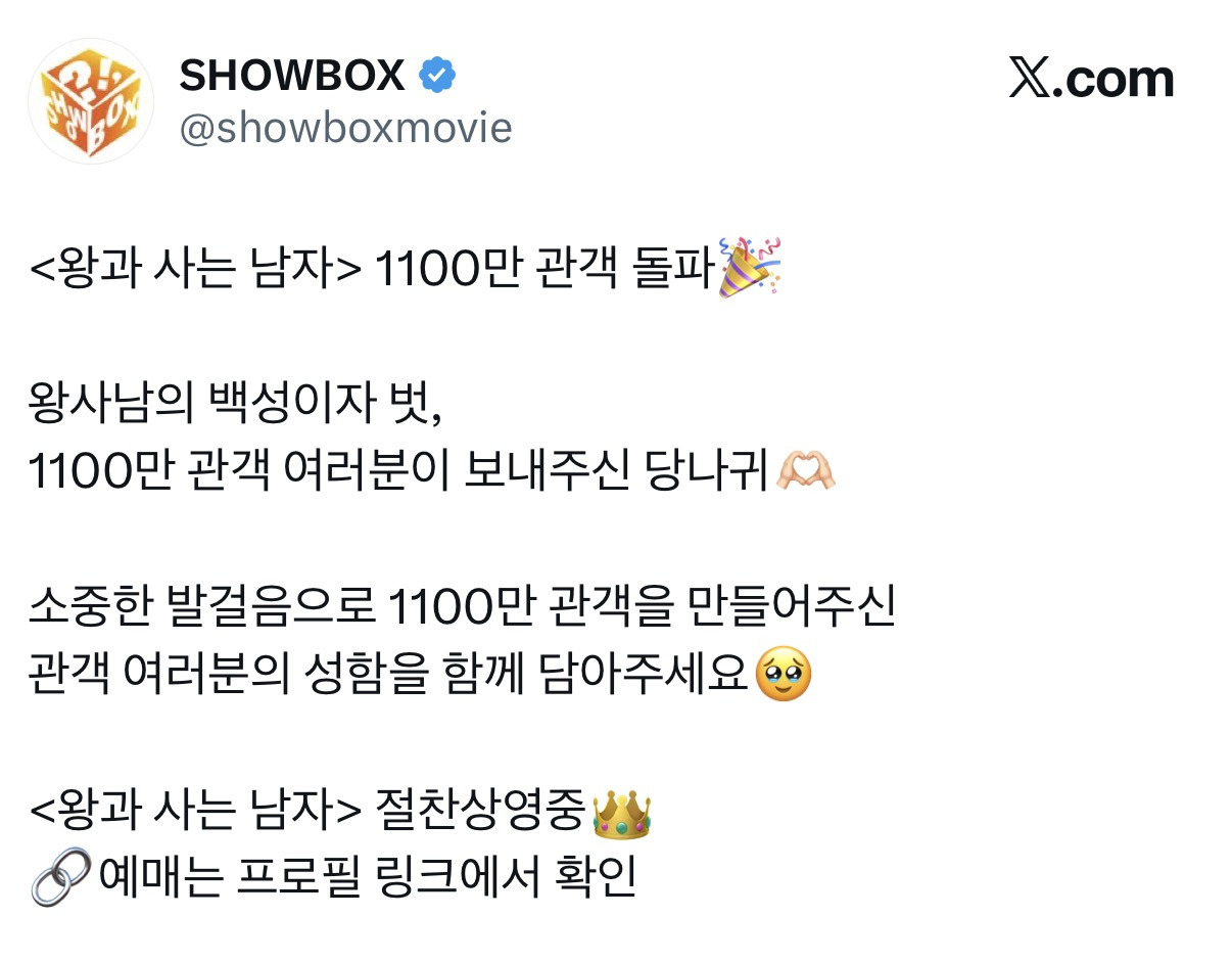 [흥미돋]<왕과 사는 남자> 1100만 관객 돌파🎉 작성자걸스이|작성시간26.03.08|조회수16,452 목록 댓글 63 글자크기 작게가 글자크기 크게가 출처: https://x.com/showboxmovie/status/2030465442494791942?s=46X의 SHOWBOX님(@showboxmovie)<왕과 사는 남자> 1100만 관객 돌파🎉 왕사남의 백성이자 벗, 1100만 관객 여러분이 보내주신 당나귀🫶🏻 소중한 발걸음으로 1100만 관객을 만들어주신 관객 여러분의 성함을 함께 담아주세요🥹 x.com 다음검색 현재 게시글 추가 기능 열기 북마크 공유하기 신고 센터로 신고 댓글 댓글 63 댓글쓰기 답글쓰기 댓글 리스트 작성자대한민국 21대대통령 이재명 | 작성시간 26.03.08 금성대군뭐야 ㅋㅋㅋㅋㅋㅋㅋㅋㅋ 작성자의지짱구다어쩔래 | 작성시간 26.03.08 우와 작성자강흊찌 | 작성시간 26.03.08 뭔가 계속보고싶은 스토리, 연기인듯.. 두번봤는데 또보고싶자나 작성자ihaebulgaria | 작성시간 26.03.08 부모님 오늘 보여드림(나는 아직) 부모님 다 좋아하셔서 뿌듯하다 아빠가 유해진 연기에 감탄 또 감탄 작성자포포포포미닛 | 작성시간 26.03.08 홍보사진엔 논란의 그들 빠졌네 댓글 전체보기