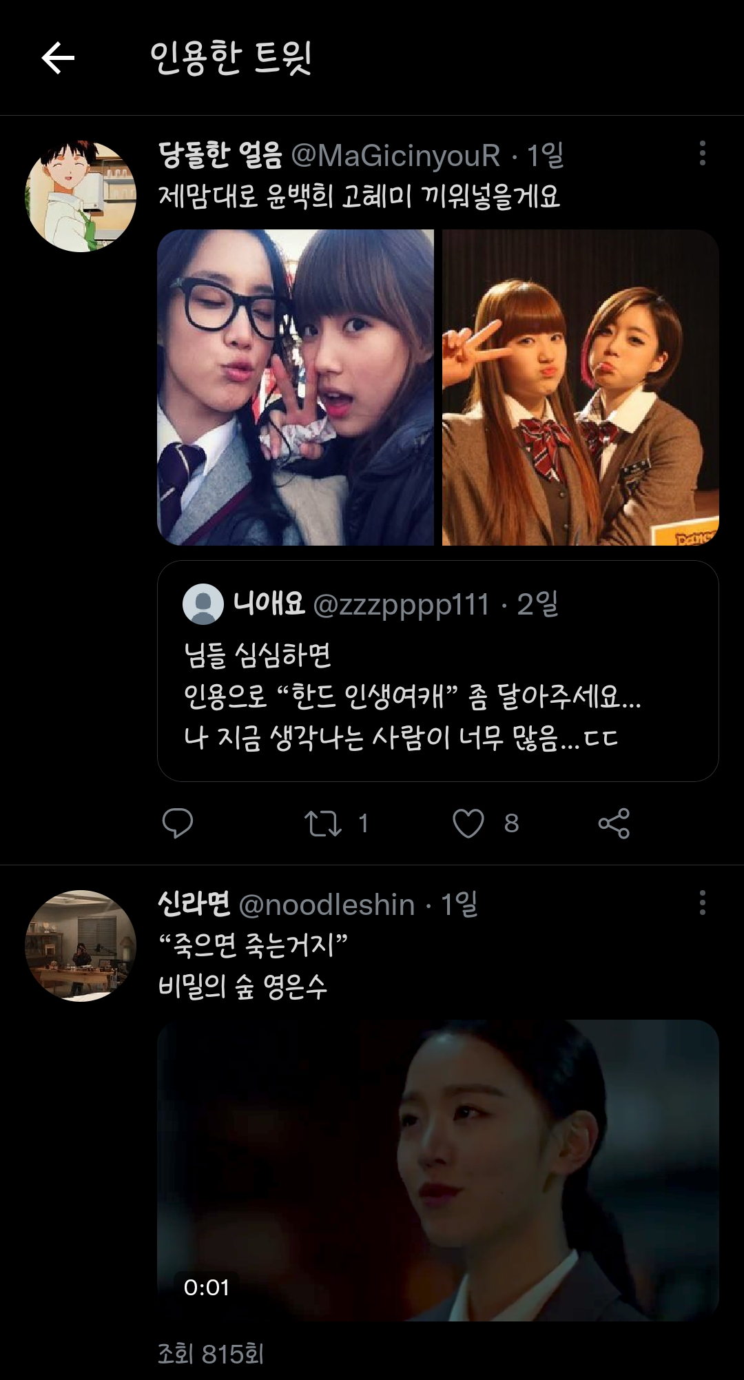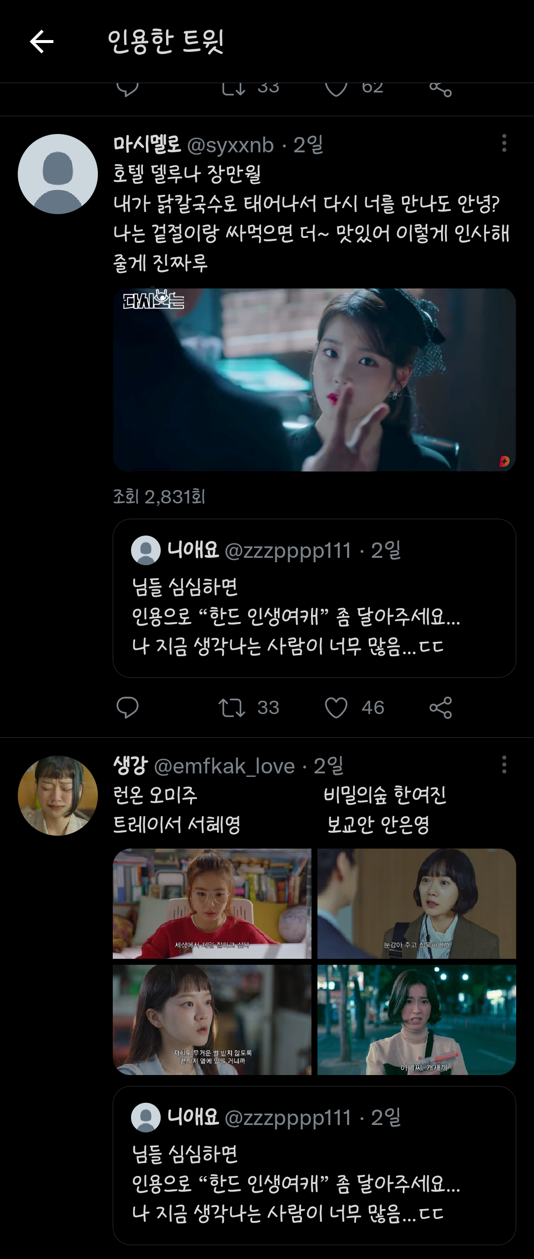 [스크랩] [흥미돋]트위터에서 인용 타고있는 '한드 인생 여캐'.twt 작성자본인 닉네임.|작성시간26.03.08|조회수23,886 목록 댓글 226 글자크기 작게가 글자크기 크게가 출처 : https://twitter.com/zzzpppp111/status/1498301274798067716?t=O_F3M2z0zft5VFeZw4iq0A&s=19니애요 on Twitter“님들 심심하면 인용으로 “한드 인생여캐” 좀 달아주세요… 나 지금 생각나는 사람이 너무 많음…ㄷㄷ”twitter.com여시들 인생여캐는 누구야? 다음검색 스크랩 원문 : *여성시대* 차분한 20대들의 알흠다운 공간 현재 게시글 추가 기능 열기 북마크 공유하기 신고 센터로 신고 댓글 댓글 226 댓글쓰기 답글쓰기 댓글 리스트 작성자바지락도 락이다 | 작성시간 26.03.09 장혜성 작성자tltmf | 작성시간 26.03.09 공주의남자, 나쁜남자 문채원 역할눈물의여왕 김지원역할 작성자한호얄 | 작성시간 26.03.09 마이네임 윤지우 작성자외조롷게생김? | 작성시간 26.03.10 삼순이 고은찬 작성자니자전거만안보여 | 작성시간 26.03.12 그사세 주준영 댓글 전체보기