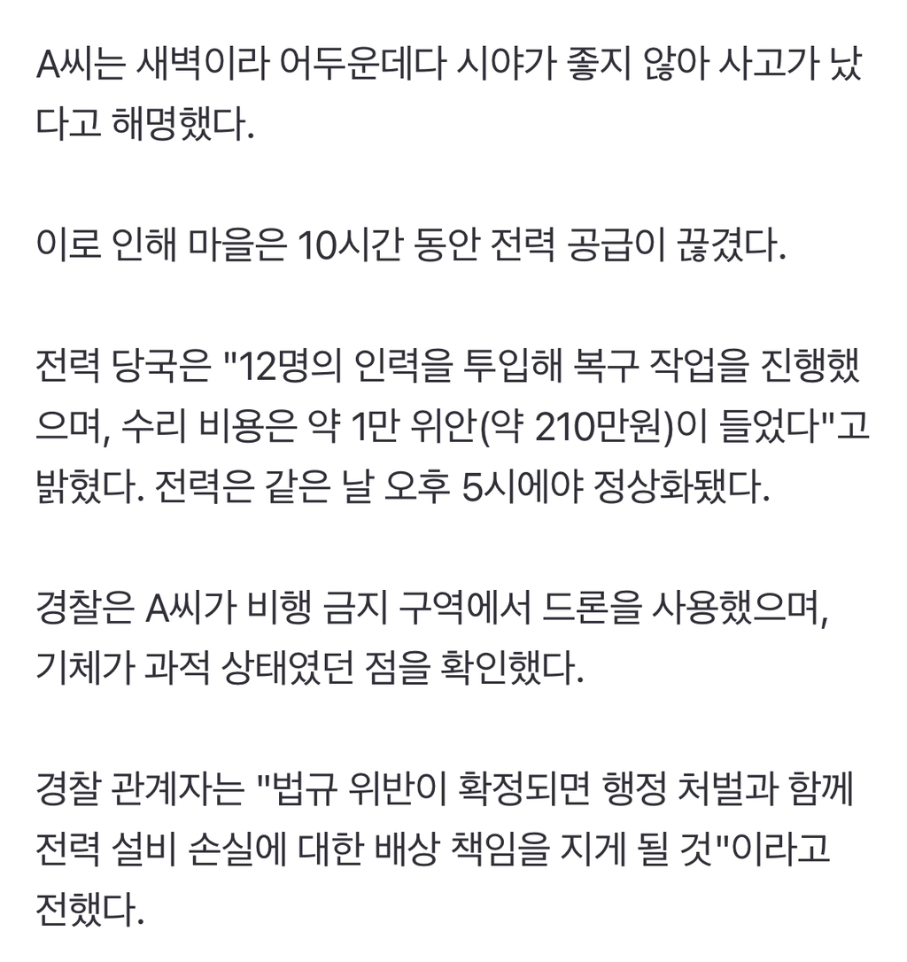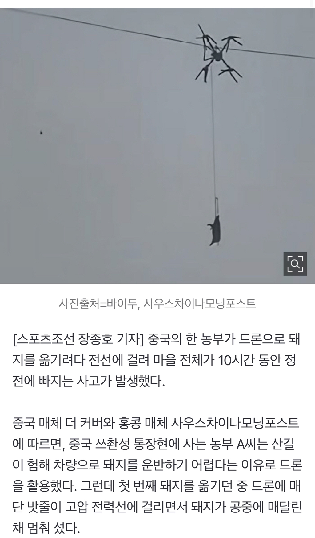 [흥미돋]공중에 매달린 돼지…운반하던 드론, 전선에 걸려 10시간 정전 작성자니나니노니고질라야|작성시간26.03.08|조회수24,346 목록 댓글 41 글자크기 작게가 글자크기 크게가 출처: https://n.news.naver.com/article/076/0004372132?sid=102공중에 매달린 돼지…운반하던 드론, 전선에 걸려 10시간 정전중국의 한 농부가 드론으로 돼지를 옮기려다 전선에 걸려 마을 전체가 10시간 동안 정전에 빠지는 사고가 발생했다. 중국 매체 더 커버와 홍콩 매체 사우스차이나모닝포스트에 따르면, 중국 쓰n.news.naver.com 다음검색 현재 게시글 추가 기능 열기 북마크 공유하기 신고 센터로 신고 댓글 댓글 41 댓글쓰기 답글쓰기 댓글 리스트 작성자홈런볼런홈 | 작성시간 26.03.08 돼지 불쌍하네... 작성자암국 | 작성시간 26.03.09 미쳤나 하.... 작성자멍1냥2 | 작성시간 26.03.09 돼지야ㅠㅠ 작성자정인아미안해사랑해 | 작성시간 26.03.09 내가 뭘 보고있는건지 작성자요키는사랑 | 작성시간 26.03.09 돌았네 댓글 전체보기