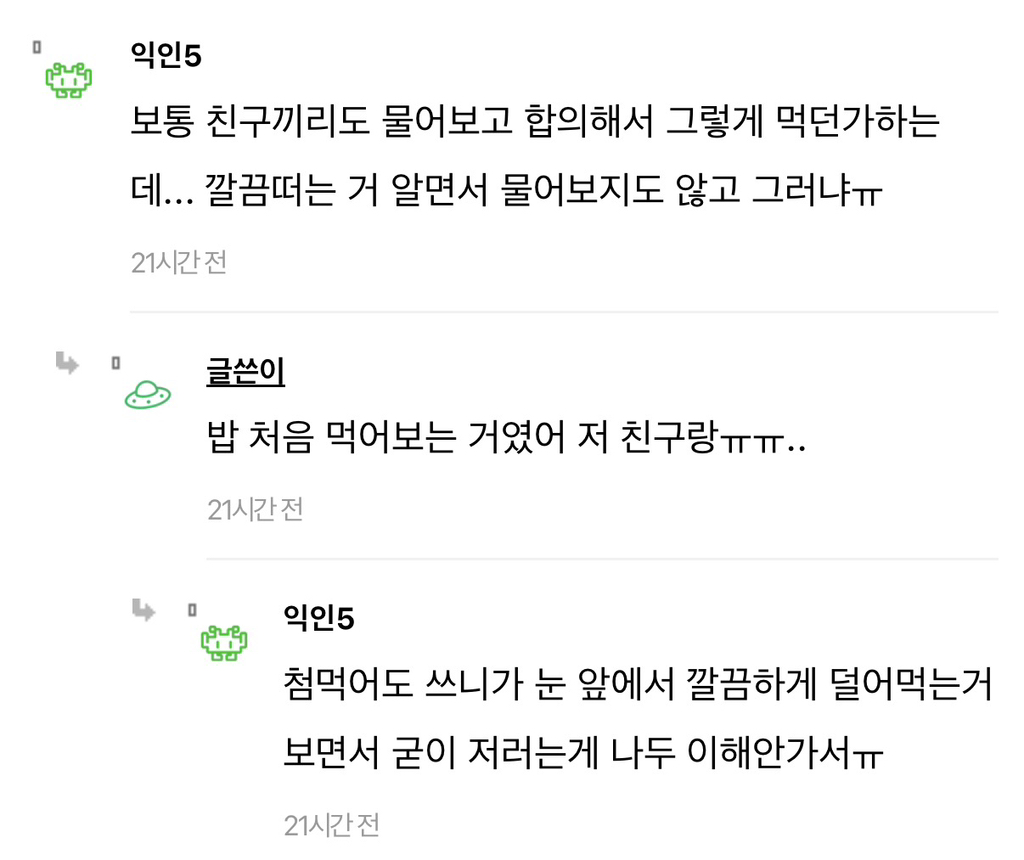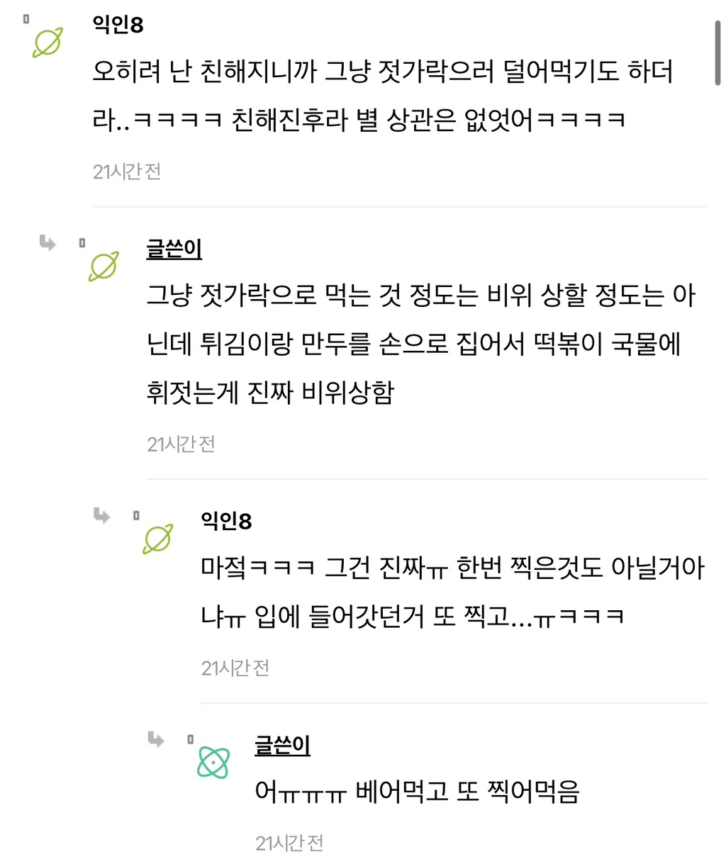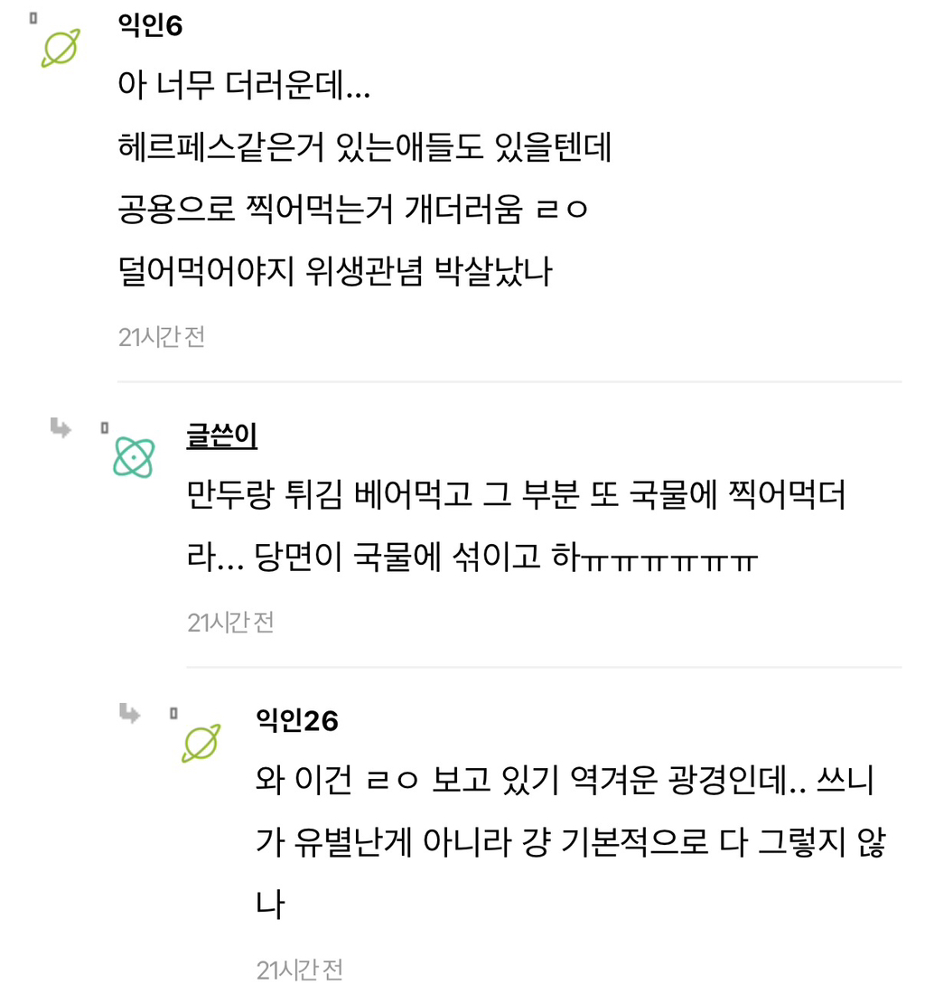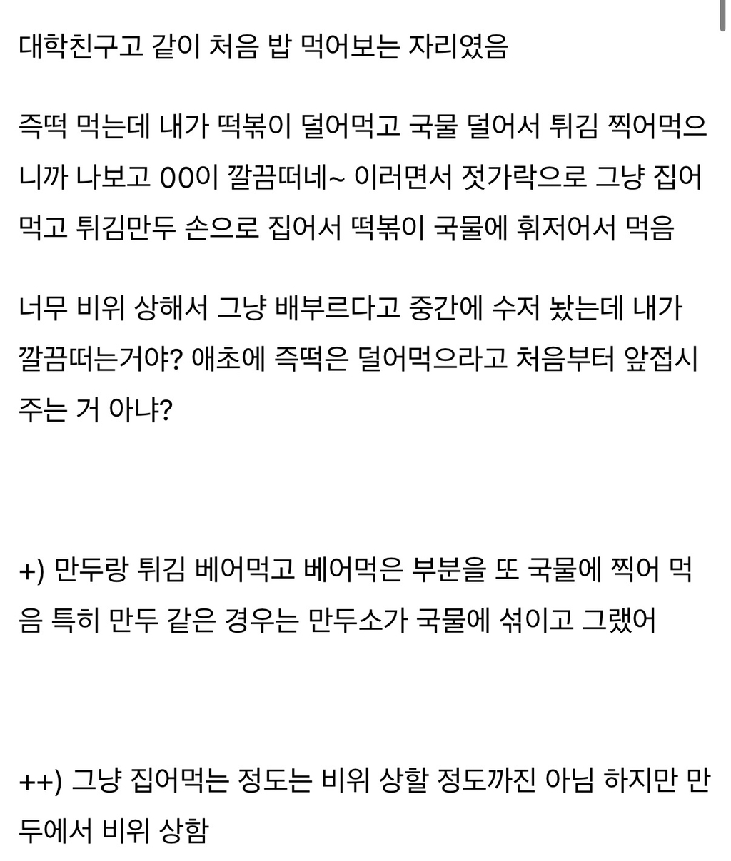 [흥미돋]친구랑 즉석떡볶이 먹는데 너무 비위상했어ㅠㅠ... 작성자희원이멸치먹어라|작성시간26.03.08|조회수121,289 목록 댓글 275 글자크기 작게가 글자크기 크게가 출처: https://www.instiz.net/name/65833076 다음검색 현재 게시글 추가 기능 열기 북마크 공유하기 신고 센터로 신고 댓글 댓글 275 댓글쓰기 답글쓰기 댓글 리스트 작성자Lovin you | 작성시간 26.03.10 첨부터 허락받고 공유하고 먹거나 한명이 난 좀...하면 따로먹고 보통 그러지않나? 난 내주변에 근데 절케 예민한사람 본적이 없음... 작성자Lacan | 작성시간 26.03.10 나는 친구면 괜찮은데 상대한테 먼저 싫어하면 안 하는 게 맞지 작성자세일러 코스모스 | 작성시간 26.03.16 으 작성자지독한얼빠 | 작성시간 26.03.19 배려가 부족하네 작성자이름뭘로하지 | 작성시간 26.03.19 아 더러워 매너없어 댓글 전체보기