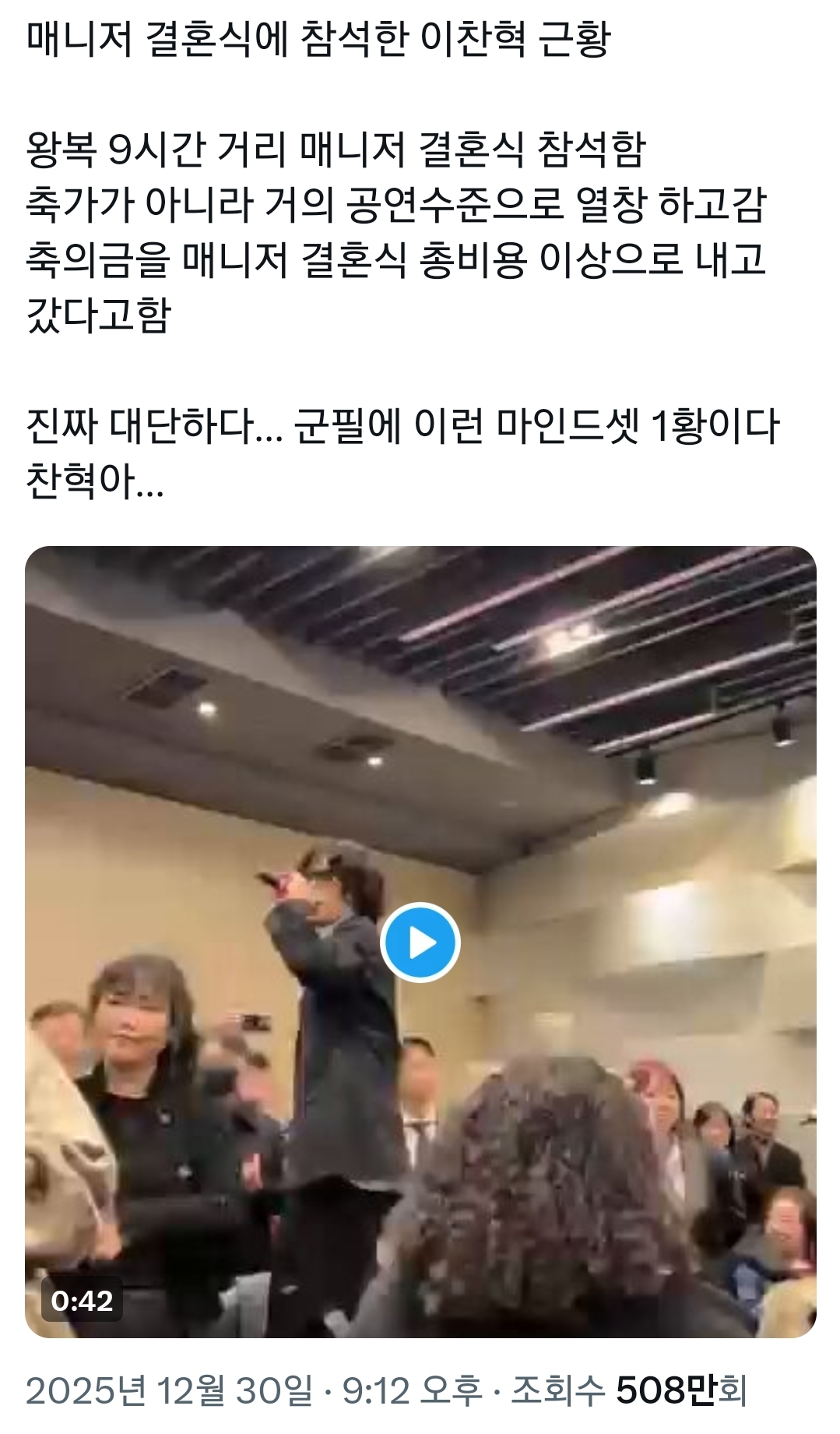 [스크랩] [흥미돋]최근 왕복 9시간 거리 매니저 결혼식에 참석한 악뮤 이찬혁 작성자나무기차|작성시간26.03.08|조회수47,125 목록 댓글 31 글자크기 작게가 글자크기 크게가 YG 입사부터 독립 신생회사까지 같이 가는 매니저 결혼식세션, 코러스, 안무까지 축가로 멸종위기사랑 불러줌 다음검색 스크랩 원문 : 도탁스 (DOTAX) 현재 게시글 추가 기능 열기 북마크 공유하기 신고 센터로 신고 댓글 댓글 31 댓글쓰기 답글쓰기 댓글 리스트 작성자매일매일더행복해진다 | 작성시간 26.03.09 와 작성자칼퇴시켜줘요 | 작성시간 26.03.09 찬혁이 개멋있다 작성자행정안전부 | 작성시간 26.03.09 멋있다 ㅋㅋㅋ 작성자두바이남혐쿠키 | 작성시간 26.03.19 와 옆에 댄스 추시는분들,코러스 델고온것도 대박이다 작성자강아쥐쥐 | 작성시간 26.03.26 돈을 진짜 돈처럼 쓴다.. 매니저분도 좋은 사람이니까 저랬겠지 댓글 전체보기