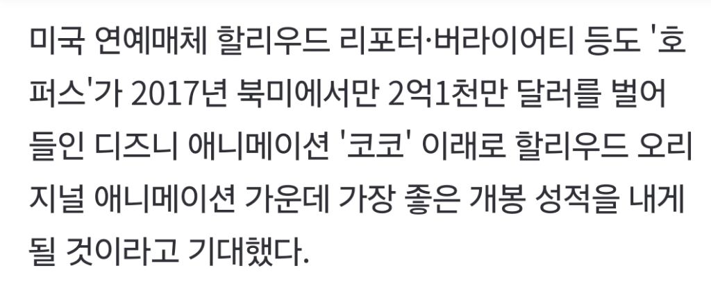 [여시뉴스데스크]애니 '호퍼스' 북미 박스오피스 1위…"'코코' 이후 최대 기대작" 작성자세상의달빛|작성시간26.03.09|조회수11,389 목록 댓글 41 글자크기 작게가 글자크기 크게가 출처: https://n.news.naver.com/article/001/0015944418?sid=104애니 '호퍼스' 북미 박스오피스 1위…"'코코' 이후 최대 기대작"김경윤 특파원 = 픽사 스튜디오에서 만든 애니메이션 영화 '호퍼스'가 상영 첫날 북미 박스오피스 1위에 올랐다. 7일(현지시간) 미국 영화흥행수입 집계사이트 박스오피스 모조 등에 따르면 픽사n.news.naver.com 다음검색 현재 게시글 추가 기능 열기 북마크 공유하기 신고 센터로 신고 댓글 댓글 41 댓글쓰기 답글쓰기 댓글 리스트 작성자돈많은백수가꿈 | 작성시간 26.03.09 동물들이 너무 귀여움 진짜 너무 귀여움 진짜 졸귀임 진짜 작성자샤뚜바나 | 작성시간 26.03.10 🦫🦫🦫❤️❤️🪵🪵🪵🪵🥔🥔🥔💞💞💞 작성자샤뚜바나 | 작성시간 26.03.10 나도 킹 조지 만나서 현명한 조언을 얻고 싶다 🦫🪵❤️💞🥔 작성자가습기에 물 채워 | 작성시간 26.03.14 🦫🦫🦫🦫❤️❤️❤️❤️❤️❤️🪵🪵🪵🪵🪵🪵🪵 작성자세탁기건조시트 | 작성시간 26.03.15 🦫🦫🦫🥔🥔🥔🪵🪵🪵❤️❤️❤️💞 댓글 전체보기