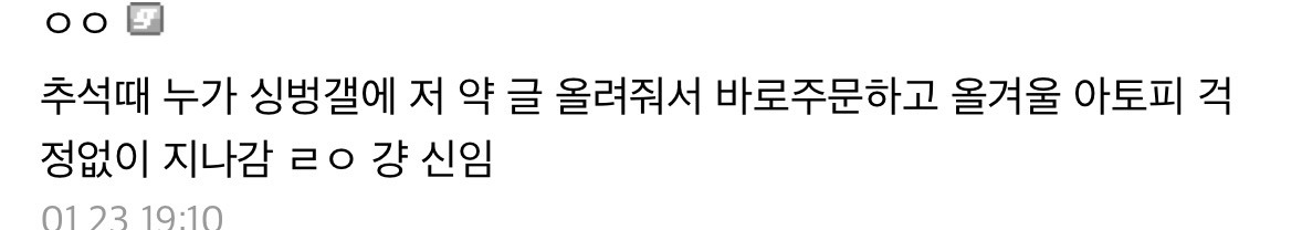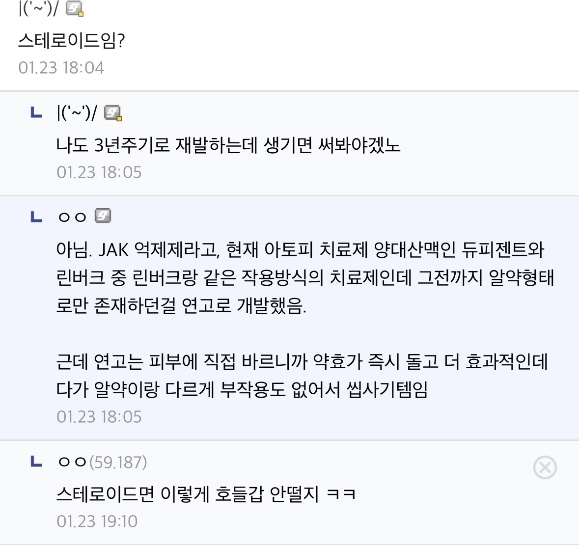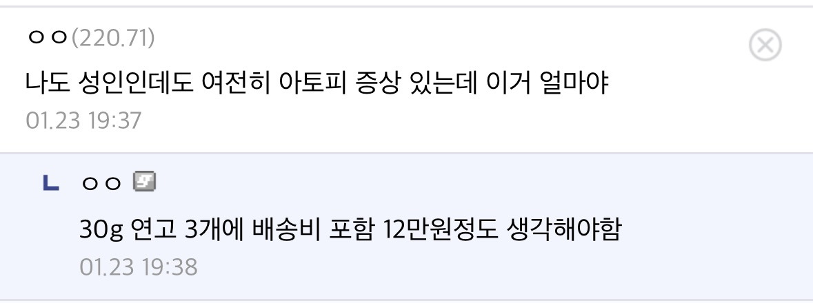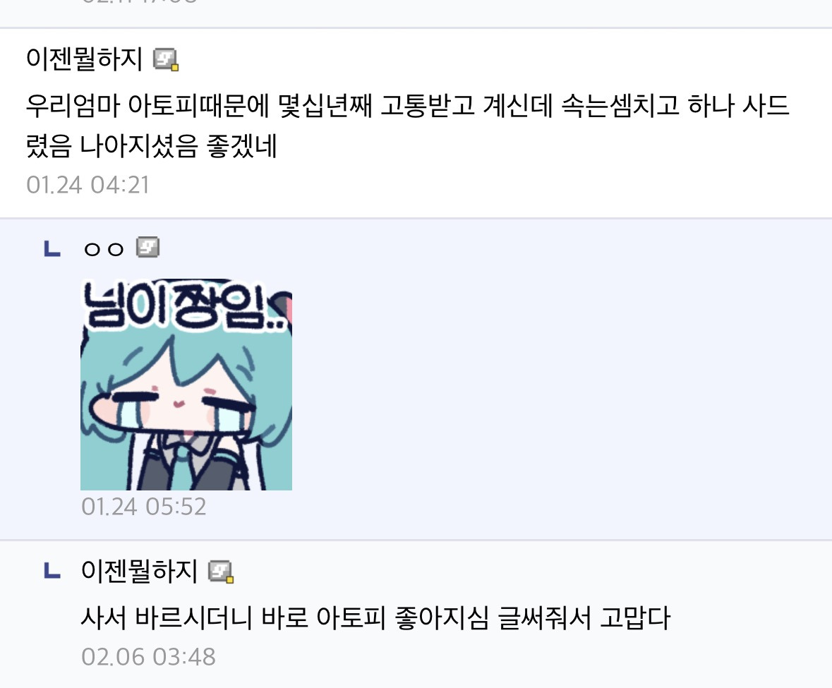 작성자똥에배찬사람 작성시간 26.04.02 진짜 개쩜 너무 비싸서 한개만 사서 해봤는데 무슨 다음날 바로 쑥 들어가 나도 중증~경증 사이고 심할때는 접히는 부위 모든 곳이 다 가렵고 긁어가지고 팔에 피떡+진물로 밤에 잠 못자는데 한번 바르고 일주일 이상이 행복하게 지낼수 있을정도로 좋아짐 얼굴에도 발랐어 요즘에 얼굴도 너무 심해서..