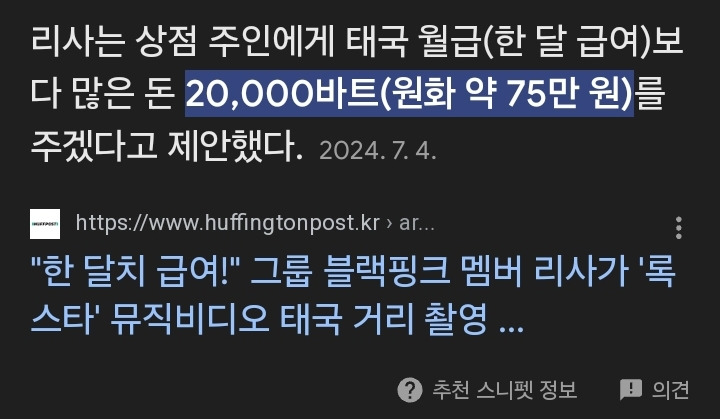 [스크랩] [흥미돋]늦은밤 잠깐 촬영하고 상점당 75만원 지급한 블랙핑크 리사 작성자행성어서점|작성시간26.03.09|조회수24,030 목록 댓글 24 글자크기 작게가 글자크기 크게가 출처: 여성시대 (본인 닉네임.)리사가 방콕 차이나타운에서 뮤비찍고상점당 75만원 정도지급이게 많은거냐 블랙핑크인데?태국 신입공무원이 60만원대임아물론 방콕 차이나타운 장사 잘되는데~~60은 너무 적은거 아님?!?!근데 여기서 장사하시는 할머니 말을 들으면무슨 하루종일 길 막고 찍은것도 아니고이미 대부분 영업이 끝난 시간인밤에 잠깐 와서 찍고 깨끗하게 치웠다고함리사가 누군지 모르지만홍보가 되서 사람도 많아져서 좋다고함 다음검색 스크랩 원문 : *여성시대* 차분한 20대들의 알흠다운 공간 현재 게시글 추가 기능 열기 북마크 공유하기 신고 센터로 신고 댓글 댓글 24 댓글쓰기 답글쓰기 댓글 리스트 작성자말진짜개개개개많은사람 | 작성시간 26.03.09 멋지다 작성자눅스립빰 | 작성시간 26.03.09 당사자가 좋다는데 다행이다ㅏㅏ 작성자Brut | 작성시간 26.03.09 리사 당연하지만 자기 나라에 자부심과 애정 갖고활동하는거 좋아보여 작성자푸딩망곰 | 작성시간 26.03.09 역시 월클 작성자내딸김사월 | 작성시간 26.03.10 서울에서 공연하는 애들도 상점당 100만원씩은 줘야하는거 아녀? 댓글 전체보기