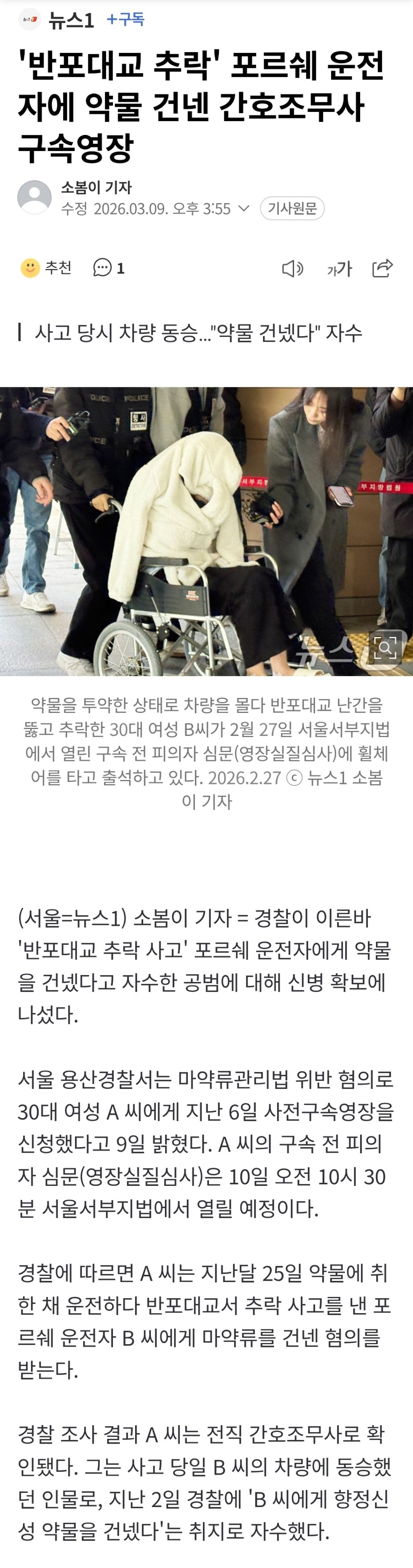 [여시뉴스데스크]'반포대교 추락' 포르쉐 운전자에 약물 건넨 간호조무사 구속영장 작성자퇴사하고싶고그런상태|작성시간26.03.09|조회수6,891 목록 댓글 4 글자크기 작게가 글자크기 크게가 출처: https://n.news.naver.com/mnews/article/421/0008815206'반포대교 추락' 포르쉐 운전자에 약물 건넨 간호조무사 구속영장경찰이 이른바 '반포대교 추락 사고' 포르쉐 운전자에게 약물을 건넸다고 자수한 공범에 대해 신병 확보에 나섰다. 서울 용산경찰서는 마약류관리법 위반 혐의로 30대 여성 A 씨에게 지난 6일 사n.news.naver.com 다음검색 현재 게시글 추가 기능 열기 북마크 공유하기 신고 센터로 신고 댓글 댓글 4 댓글쓰기 답글쓰기 댓글 리스트 작성자요추염좌최악임조심하셈 | 작성시간 26.03.09 전직 간조인데 저런 약물을 빼돌릴 수가 있어? 대리자수한건 아니겠지;; 영화 너무 봤나 답댓글 작성자부산콘서트홀 | 작성시간 26.03.09 헉 작성자참외냠 | 작성시간 26.03.09 동승했던 사람이면 사고 조사중에 말한거같기도하고... 팔로워 11만명 인플 누구지 답댓글 작성자퇴사하고싶고그런상태 작성자 본인 여부 작성자 | 작성시간 26.03.09 계정 다 떴는데 팔로워 11만명인데 진짜 처음보는 계정이었음.. 댓글 전체보기