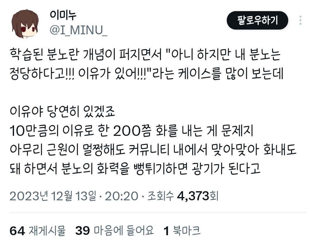 작성자겨울이다 작성시간 26.03.09 나도 성격 많이 버렸어. 그래서 이제는 여시에서 무조건 분노하는 것이나 무조건 혐오하는 것에 혼자 반박해보는 연습을 하는 중