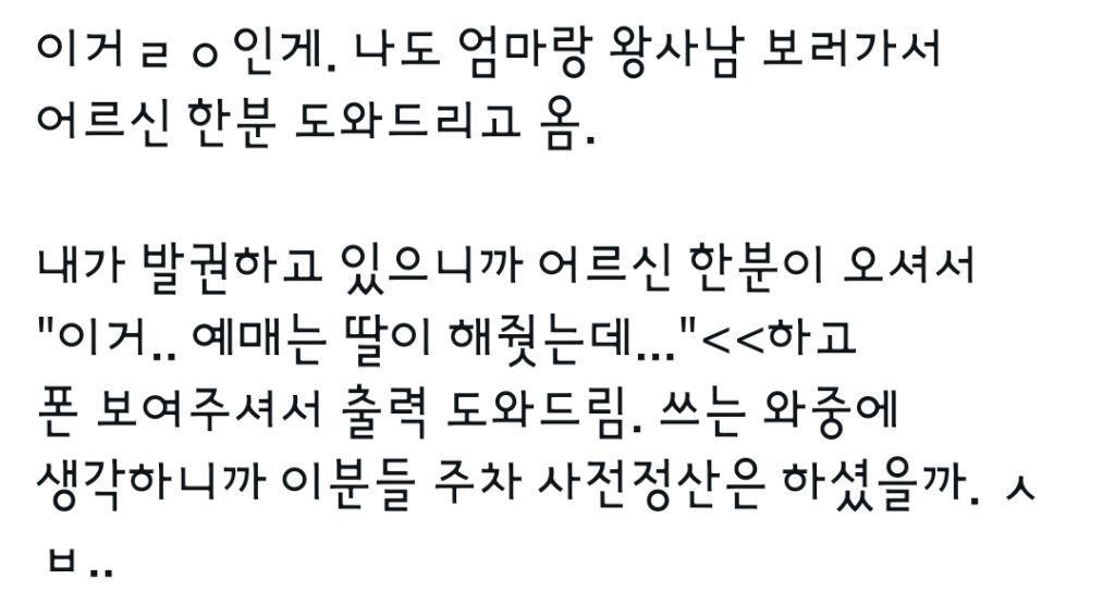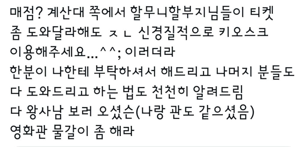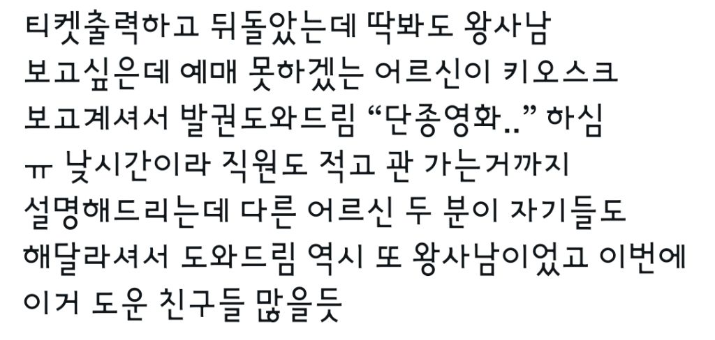 작성자가나..디 작성시간 26.03.10 헐 나도 예매한거 뽑을라고 키오스크에 잇엇는데 앞에 잇던 같은 아파트 할저씨가 예매할줄몰라수 우왕좌왕하시길래 도와드림
