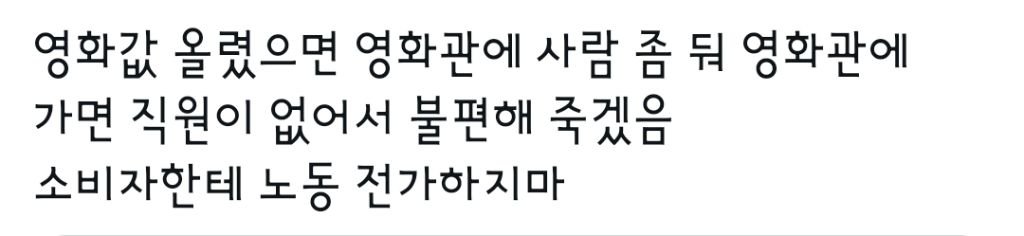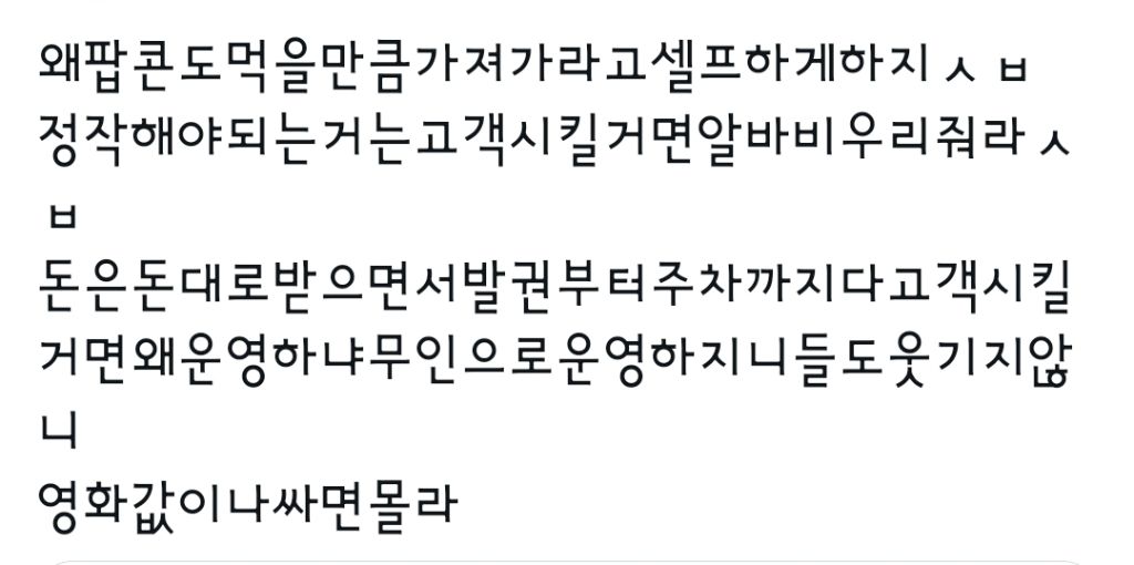 작성자구가지니 작성시간 26.03.10 맞아 그리고 ㅅㅂ 직원들 내가 봐도 싸가지없게 대하는것도 개빡침 직원교육도 똑바로 시키고 직원 더 데려와 영화값만 올리고 진짜 기본은 나락갔음