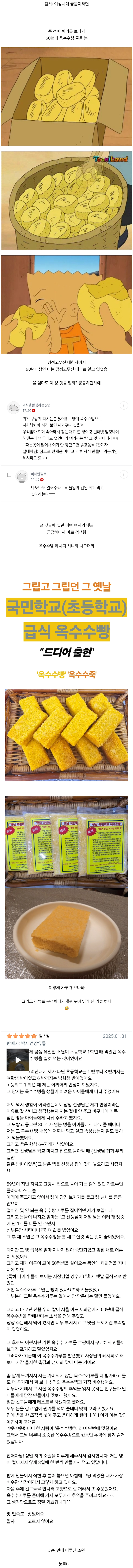 어려운 시절을 견디고 따뜻한 어른이 되신거 같다 옥수수빵을 찾은 기쁨을 주위 친구들에게 또 나누시는 모습을 보니 마음이 훈훈해ㅠㅠ -