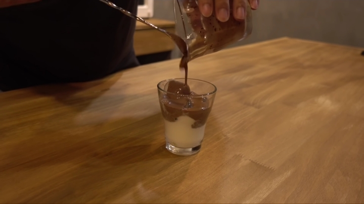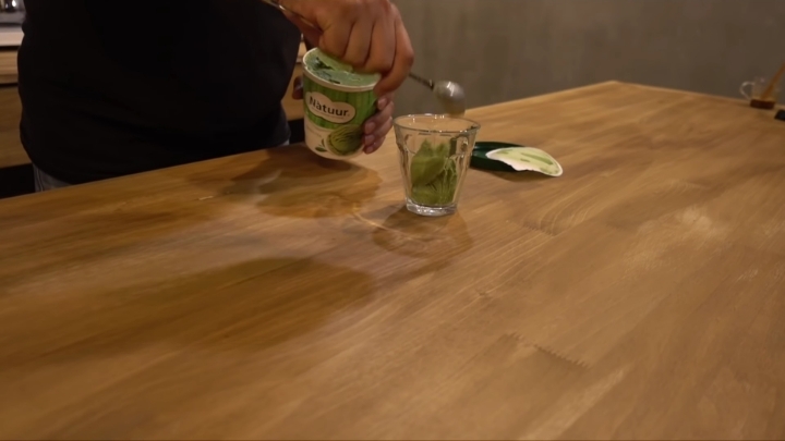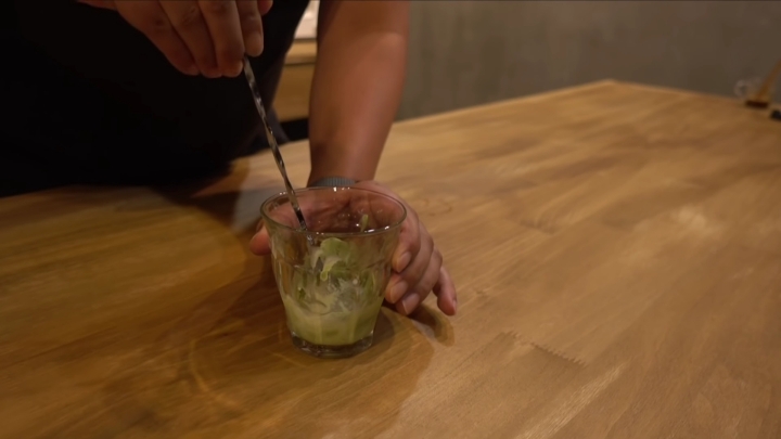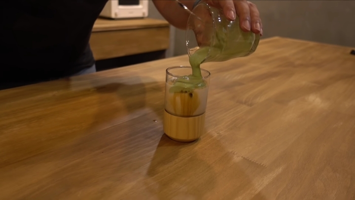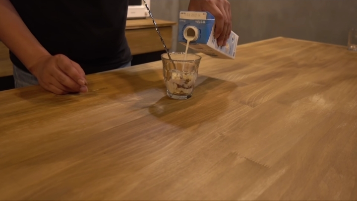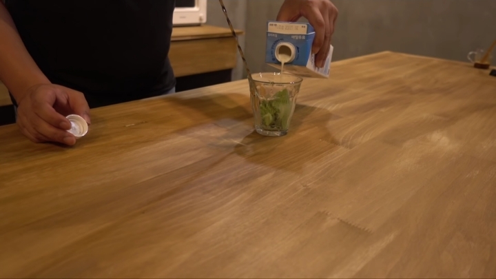 얼음잔에 우유, 커피 믹스, 녹차아이스크림 순으로 붓기