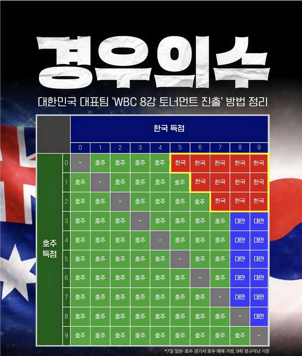 대만은 우리나라가 8점 이상 점수를 내야 올라갈 수 있는데