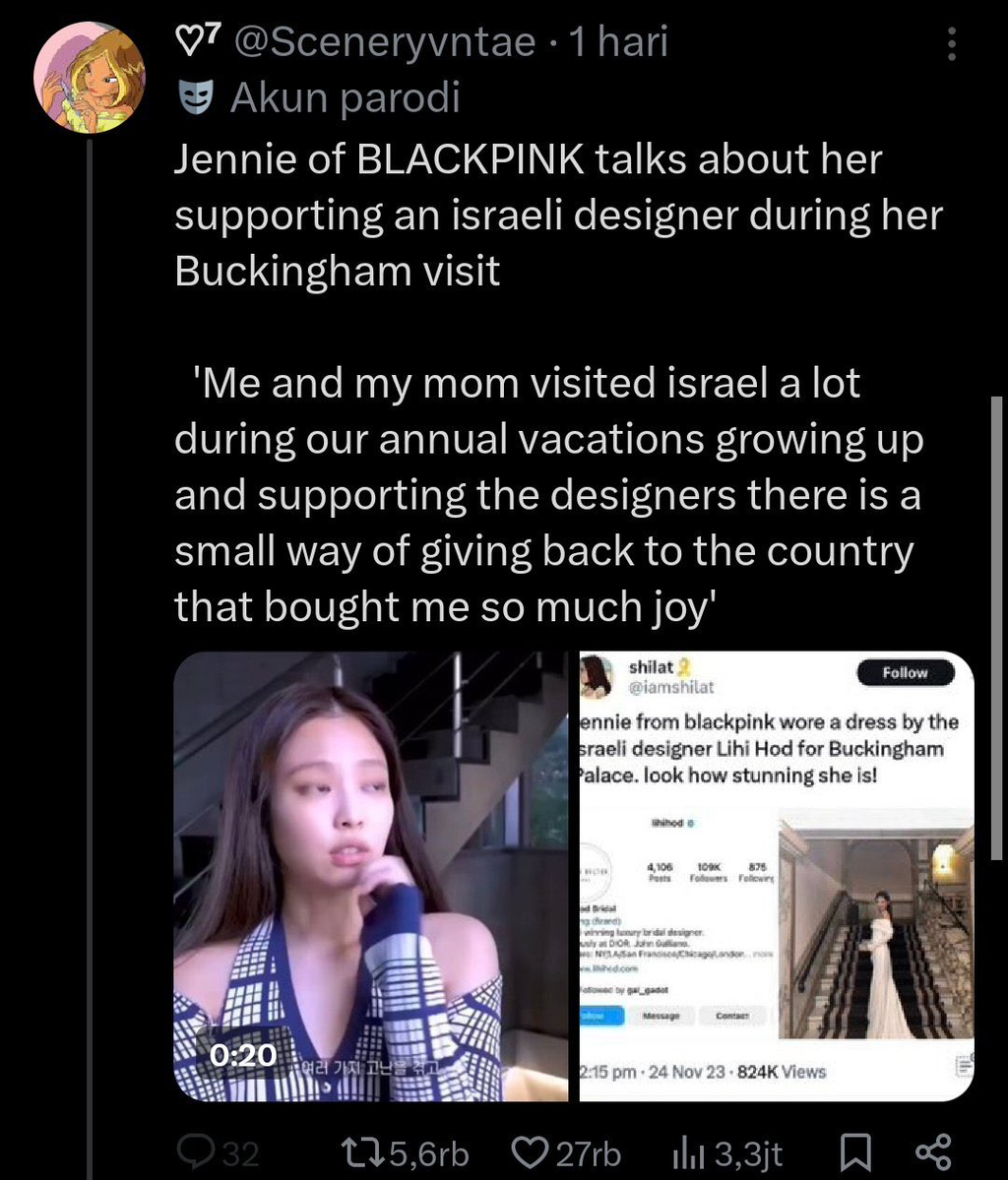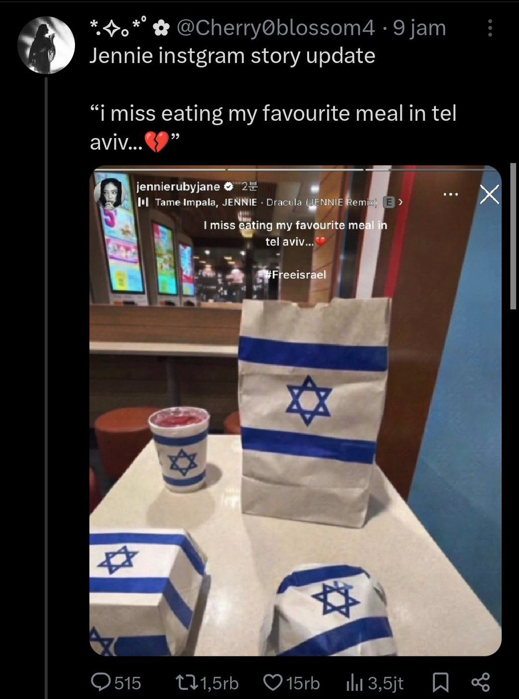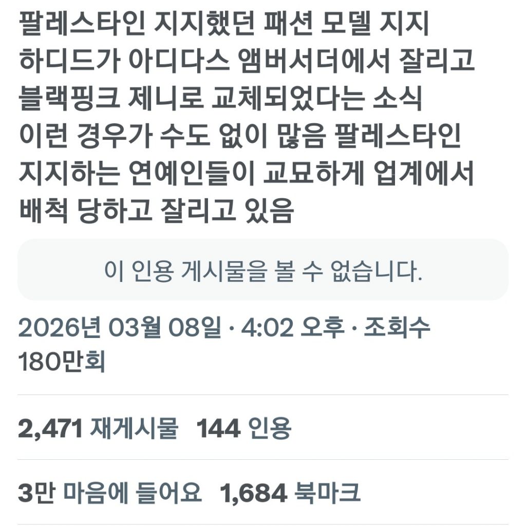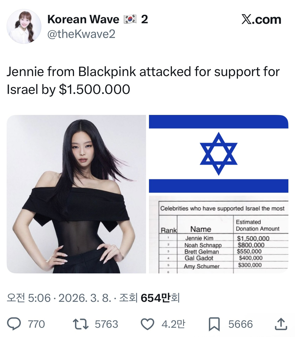 지금 해외에서 제니=이스라엘 적극 지지자라는 날조소식이 해외에서 걷잡을수 없이 퍼지고 있음