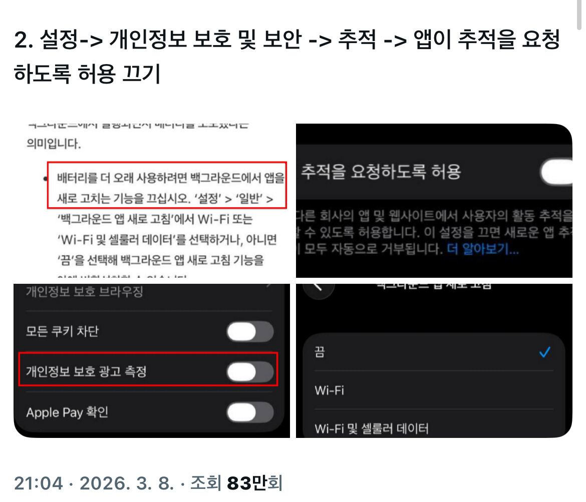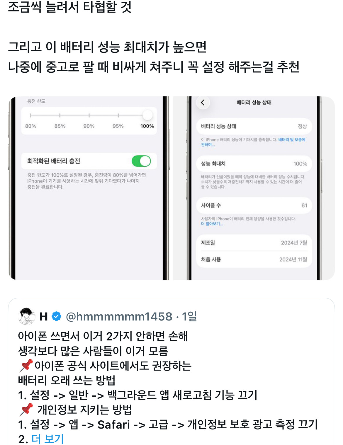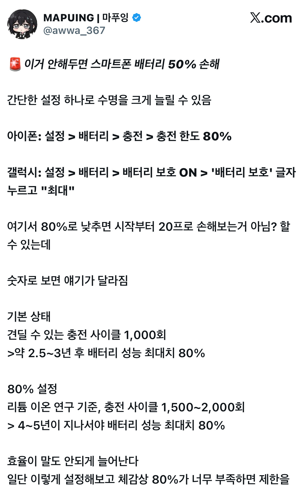 80%만 충전해서 쓰는거 배터리 효율 떨어진 폰 쓰는거랑 뭐가다르냐는 댓글 보고 나는 그냥 100% 씀 -