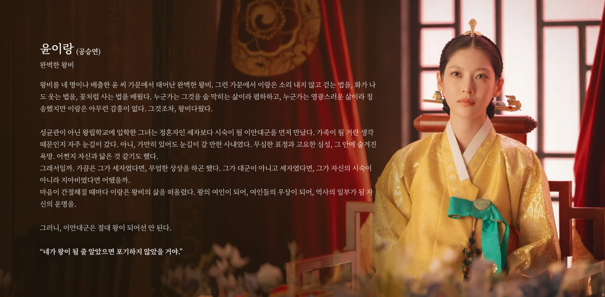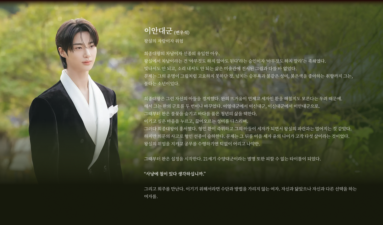 이안대군의 형이자 윤의 아버지. 타고나길 예민하고 놀기 좋아하는 한량이라 왕이 될 재목은 아니었다. 하지만 장자 승계가 원칙인 왕실에서 의무를 저버리고 도망칠 방법은 어디에도 없었다.
