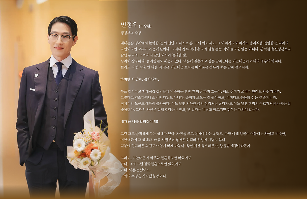 현 행정부 수장인 민정우의 수석비서관. 왕립학교를 수석 졸업하고 행정고시 전국 수석까지 거머쥔 인물로, 전형적인 엘리트 코스를 밟아온 수재다.정우의 할아버지가 총리였을 때부터, 민영은 그 옆에 선 비서들을 동경했고, 정우의 아버지가 총리직을 맡자마자 비서실에 입문했다. 그의 긴 임기를 함께하고 그의 아들인 정우가 총리에 임명되던 날, 그 역시 총리실의 수석비서관으로 지명됐다.