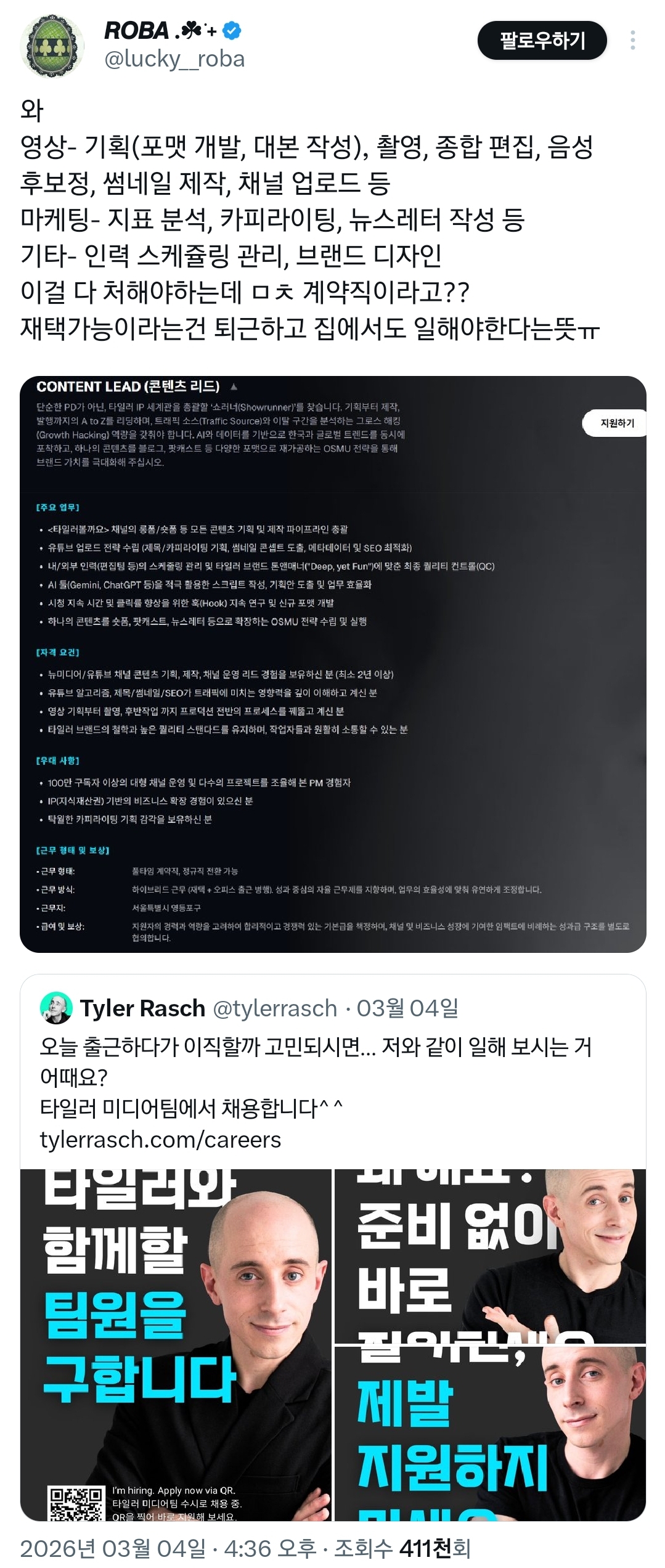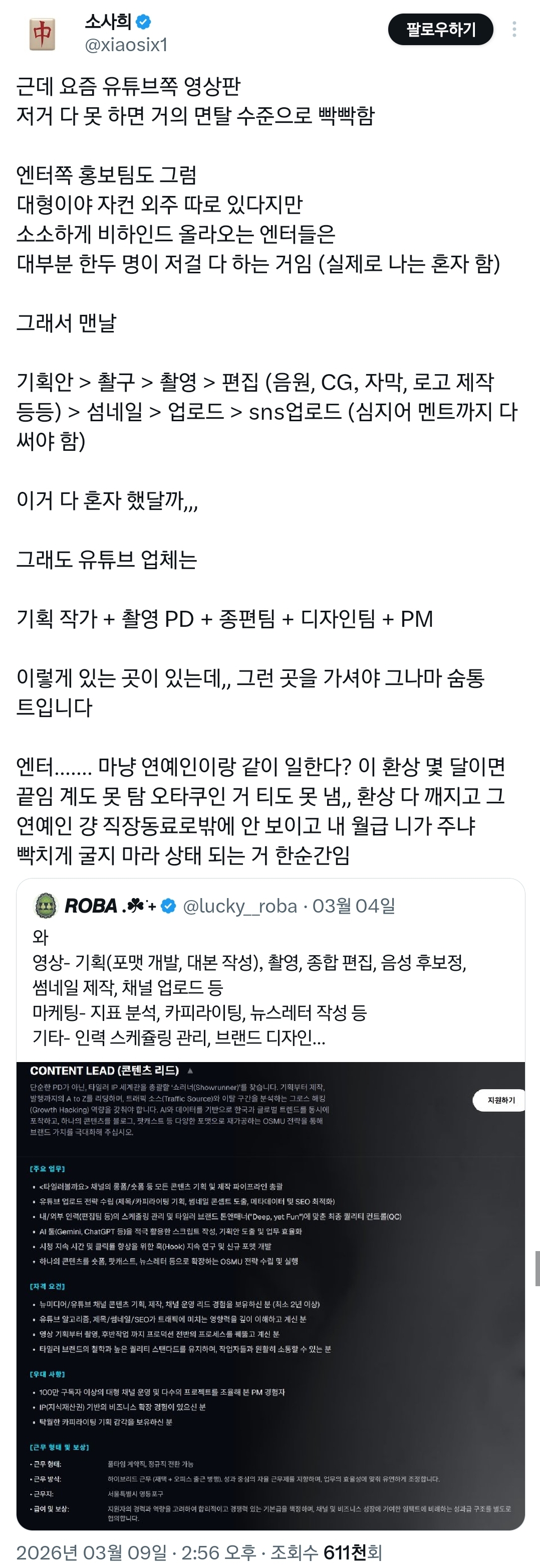작성자왱왱왱 작성시간 26.03.11 프로구단 일부 유튜브도 혼자하자나 ㅋㅋㅋㅋ 진짜 죽어나....