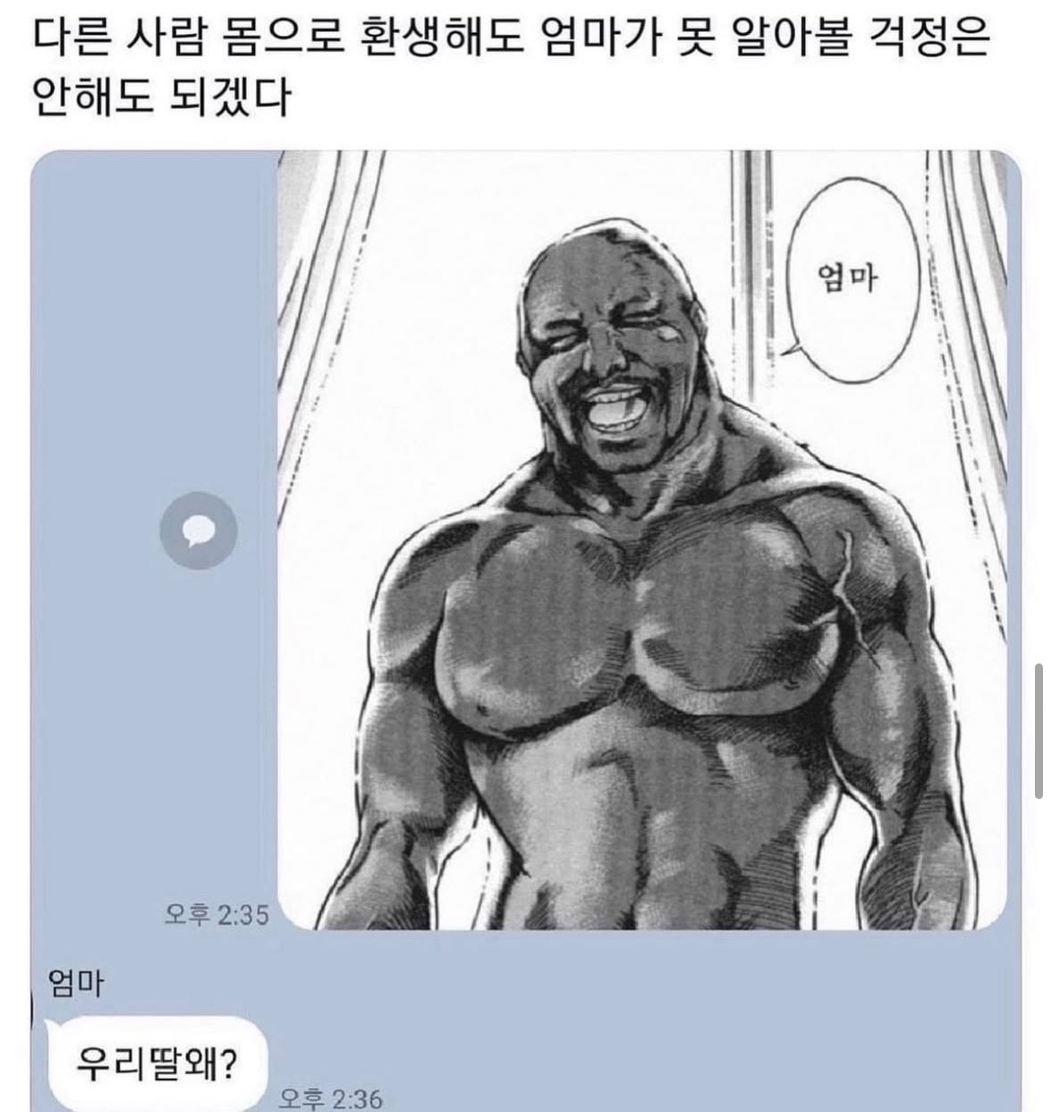 [흥미돋]다른 사람 몸으로 환생해도 엄마가 못 알아볼 걱정은 안해도 됨.x 작성자누룩곰팡이|작성시간26.03.12|조회수14,169 목록 댓글 9 글자크기 작게가 글자크기 크게가 출처: https://x.com/i/status/2031587043546116297ㅁㅂ편견없으심 다음검색 현재 게시글 추가 기능 열기 북마크 공유하기 신고 센터로 신고 댓글 댓글 9 댓글쓰기 답글쓰기 댓글 리스트 작성자파하하학 | 작성시간 26.03.12 ㅋㅋㅋㅋㅋㅋㅋㅋㅋㅋㅋㅋㅋㅋㅋ 작성자KhvichaKvaratskhelia | 작성시간 26.03.12 그림 ㅋㅋㅋㅋㅋㅋㅋㅋㅋ 작성자타볼래 | 작성시간 26.03.12 아 정말 어이없고 웃김 ㅜ ㅋㅋㅋ 작성자뱅크샐러드 | 작성시간 26.03.12 짤이 ㅈㄴ웃겨서 찾아옴ㅋㅋㅋㅋ 이미지 확대 작성자띠로리리로 | 작성시간 26.03.12 ㅁㅊㅋㅋㅋ 댓글 전체보기