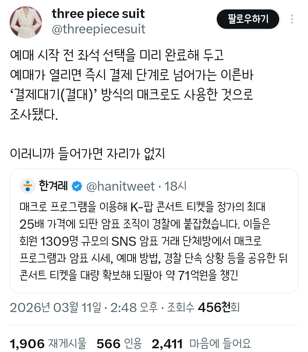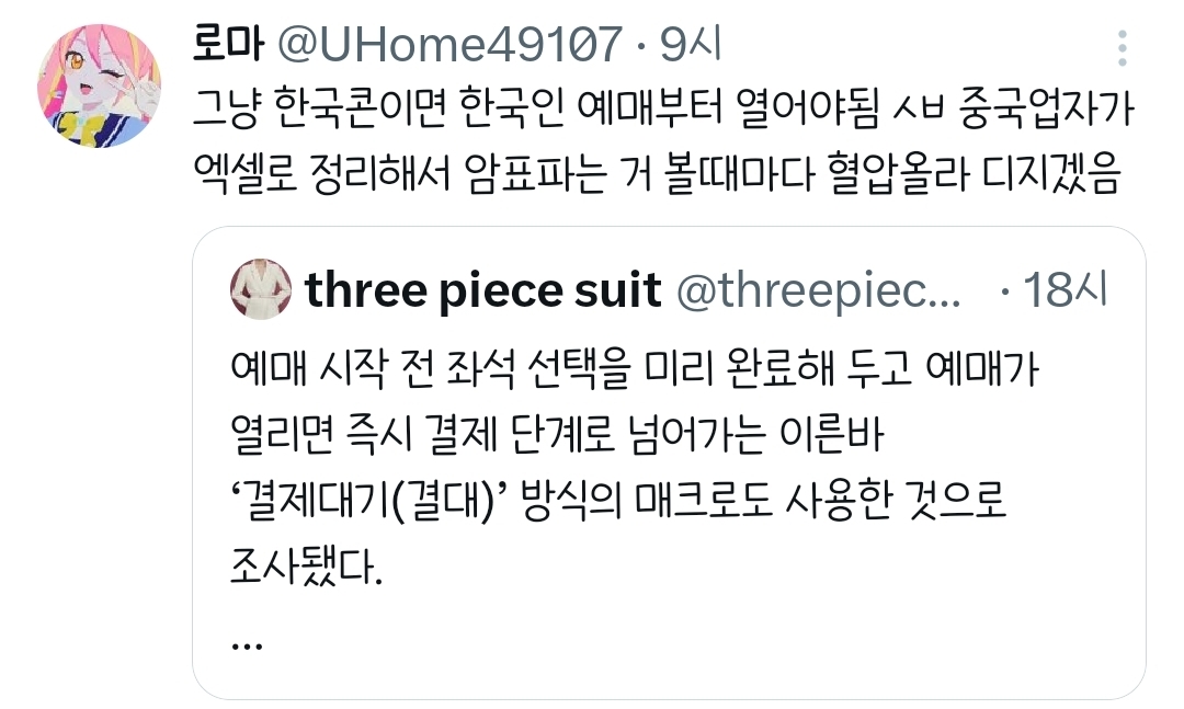 작성자외계 생명체 626호 스티치 작성시간 26.03.12 하 존나 준비하고 눌렀더니 매크로 의심된다고 팅겼는데 오픈 10분도 안돼서 번장에 한명이 10장씩 파는거보고 존나 현타