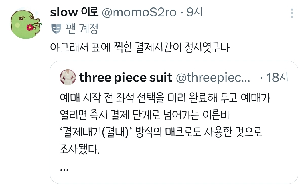 작성자나 6천원 있어요... 작성시간 26.03.12 존나 음모론일지 모르겠는데 예매플랫폼도 플미랑 연결되어있는거 아냐?