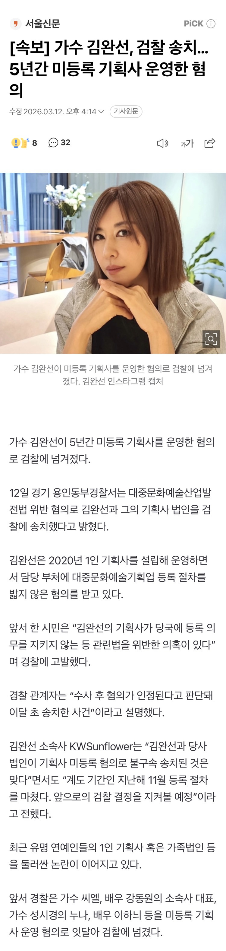 [여시뉴스데스크][속보] 가수 김완선, 검찰 송치…5년간 미등록 기획사 운영한 혐의 작성자꿀밤보살|작성시간26.03.12|조회수57,965 목록 댓글 26 글자크기 작게가 글자크기 크게가 출처: https://n.news.naver.com/article/081/0003625344?type=breakingnews&cds=news_edit[속보] 가수 김완선, 검찰 송치…5년간 미등록 기획사 운영한 혐의가수 김완선이 5년간 미등록 기획사를 운영한 혐의로 검찰에 넘겨졌다. 12일 경기 용인동부경찰서는 대중문화예술산업발전법 위반 혐의로 김완선과 그의 기획사 법인을 검찰에 송치했다고 밝혔n.news.naver.com 다음검색 현재 게시글 추가 기능 열기 북마크 공유하기 신고 센터로 신고 댓글 댓글 26 댓글쓰기 답글쓰기 댓글 리스트 작성자A Star Is Born | 작성시간 26.03.12 이런 케이스 왜이렇게 많아 작성자악운에강한여시 | 작성시간 26.03.12 약간 연옌들사이 꿀팁같은거였나봄 다들 한거보니 작성자세무사24 | 작성시간 26.03.13 연예인 돈도 많은것들이 양심이 없네 작성자kiiikiii키야 | 작성시간 26.03.13 연예인들 전수 조사갑시다 작성자헤어나와야 | 작성시간 26.03.13 와우 ㅋㅋㅋㅋㅋ 연옌만 되면 다들 법 위에 돈있다생각하나밬ㅋㅋㅋㅋ 댓글 전체보기