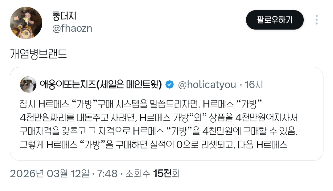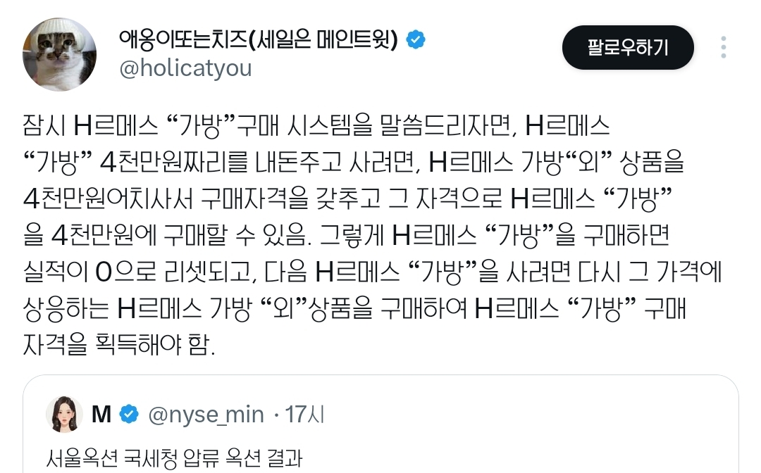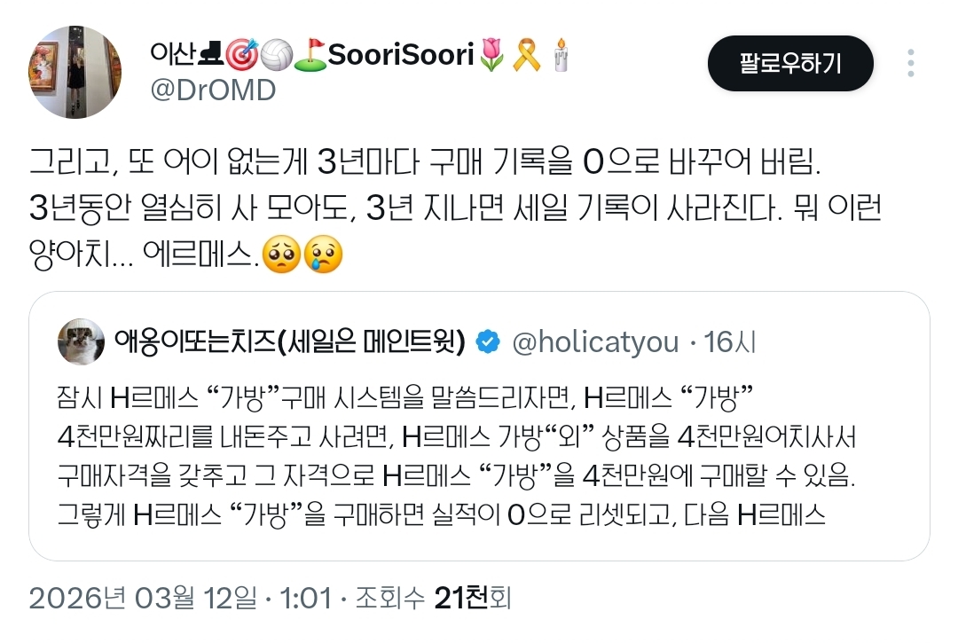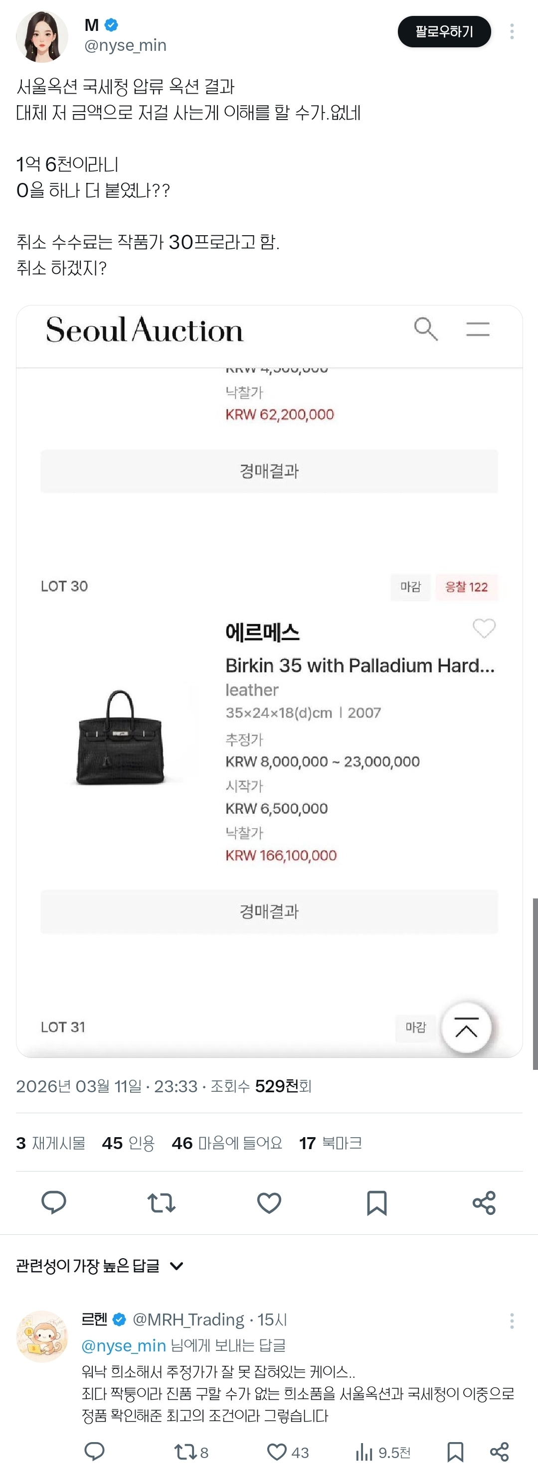 [흥미돋]서울옥션 국세청 압류 에르메스 가방 옥션 결과 작성자카이지|작성시간26.03.12|조회수92,507 목록 댓글 175 글자크기 작게가 글자크기 크게가 출처: https://x.com/i/status/2031740338390622527https://x.com/i/status/2031740338390622527https://x.com/i/status/2031745623985435058https://x.com/i/status/2031762480889036927https://x.com/i/status/2031864979620839600 다음검색 현재 게시글 추가 기능 열기 북마크 공유하기 신고 센터로 신고 댓글 댓글 175 댓글쓰기 답글쓰기 댓글 리스트 작성자antifreeze | 작성시간 26.03.13 지인의 절친이 셀러인데 그런경우에도 뚫고못사는거지? 걍궁금사항 작성자차차차녹차 | 작성시간 26.03.14 그럼 저 가방 판매가가 얼마인지도 몰라?? 대박이네 작성자증말죄질이야 | 작성시간 26.03.17 개염병메스 작성자수금지화 | 작성시간 26.03.17 저건진짜 가방을 사는게아니구나 작성자퇴근시켜줘욧 | 작성시간 26.03.21 염병 댓글 전체보기