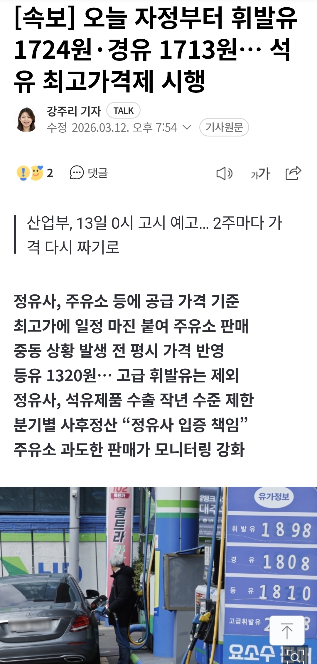 13일 0시부터 정유사가 주유소에 판매하는 공급 가격을 제한하는 석유 최고가격제가 시행된다. 휘발유 가격은 ℓ당 1724원, 경유 1713원, 등유 1320원이다.