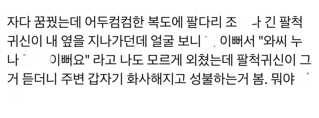 [기타]의외로 귀신 성불이 가능한 방법 작성자로또여내게로오라|작성시간26.03.12|조회수17,501 목록 댓글 20 글자크기 작게가 글자크기 크게가 출처: 여성시대 로또여내게로오라https://x.com/howcowu/status/2032022316327252269?s=46X의 HOWCOW uuu님(@HowcowU)자다 꿈꿨는데 어두컴컴한 복도에 팔다리 조온나 긴 팔척귀신이 내 옆을 지나가던데 얼굴 보니 개 이뻐서 "와씨 누나 존나 이뻐요" 라고 나도 모르게 외쳤는데 팔척귀신이 그거 듣더니 주변 갑x.com문제시 수정! 다음검색 현재 게시글 추가 기능 열기 북마크 공유하기 신고 센터로 신고 댓글 댓글 20 댓글쓰기 답글쓰기 댓글 리스트 작성자lateCheckout | 작성시간 26.03.13 귀신까지 외모정병 ㅠ 답댓글 작성자pannkaka | 작성시간 26.03.13 2 ㅋㅋㅋㅋㅋㅋ ㅠ 작성자귀인상봉나에게로 | 작성시간 26.03.13 한국 귀신들 참 착해.. 일본이랑 너무다름 작성자두배짬봉 | 작성시간 26.03.13 고백공격으로 승천한건줄 ㄷㄷ 작성자외로운늑대 | 작성시간 26.03.13 빨간마스크는 이쁘다 하면 안됨 댓글 전체보기