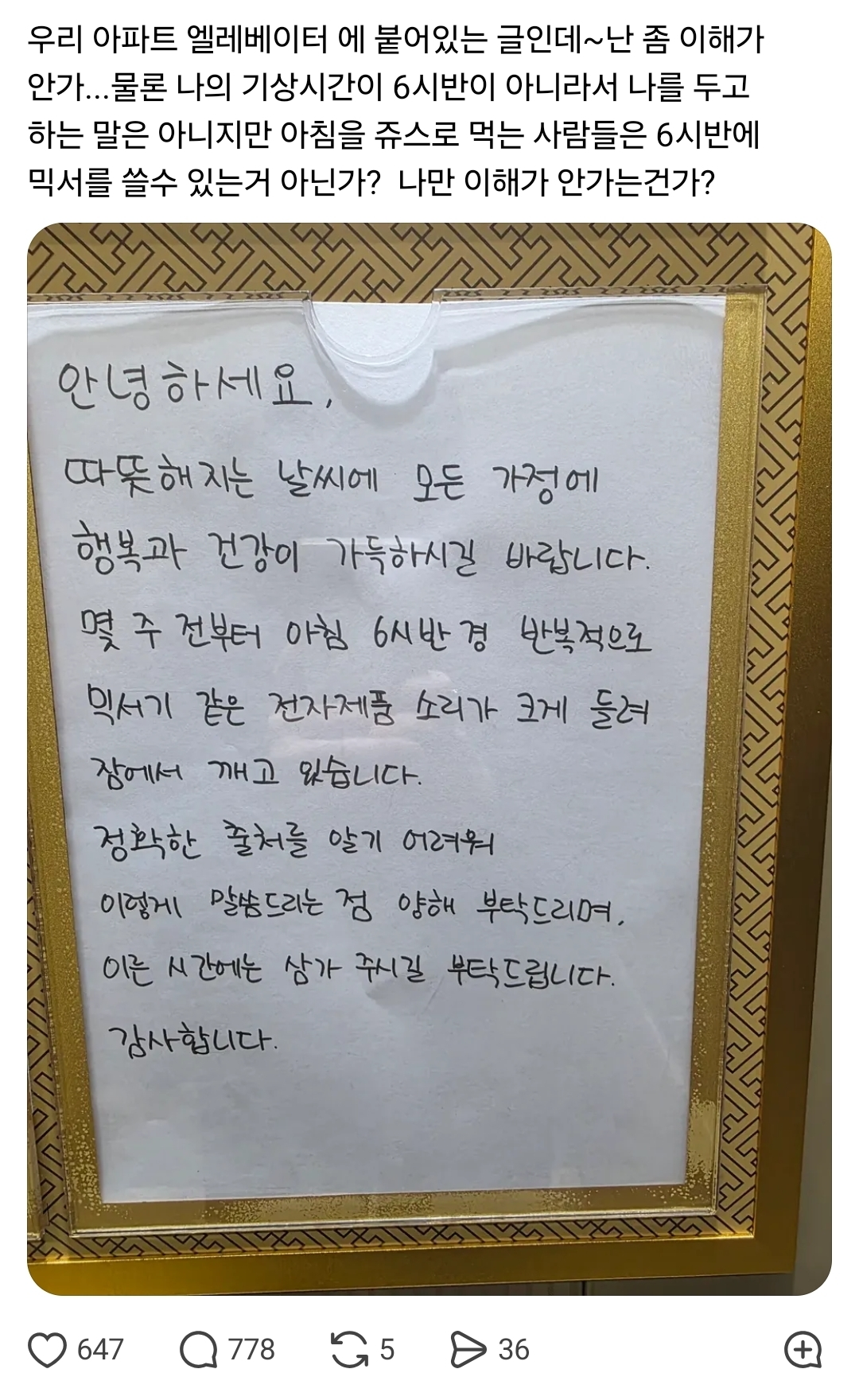 작성자보라색꿈 작성시간 26.03.23 우리아파트 6:20에엘베타면 꽉차거든..(내출근시간) 그만큼많은사람이 깨있어