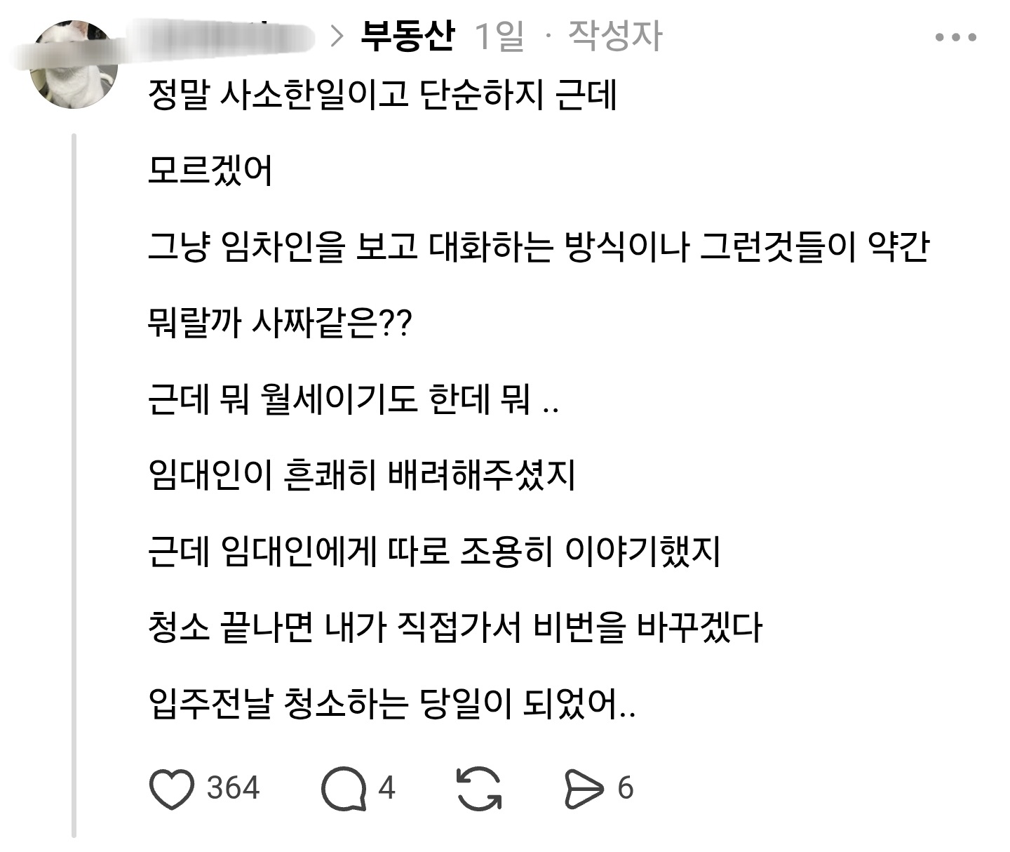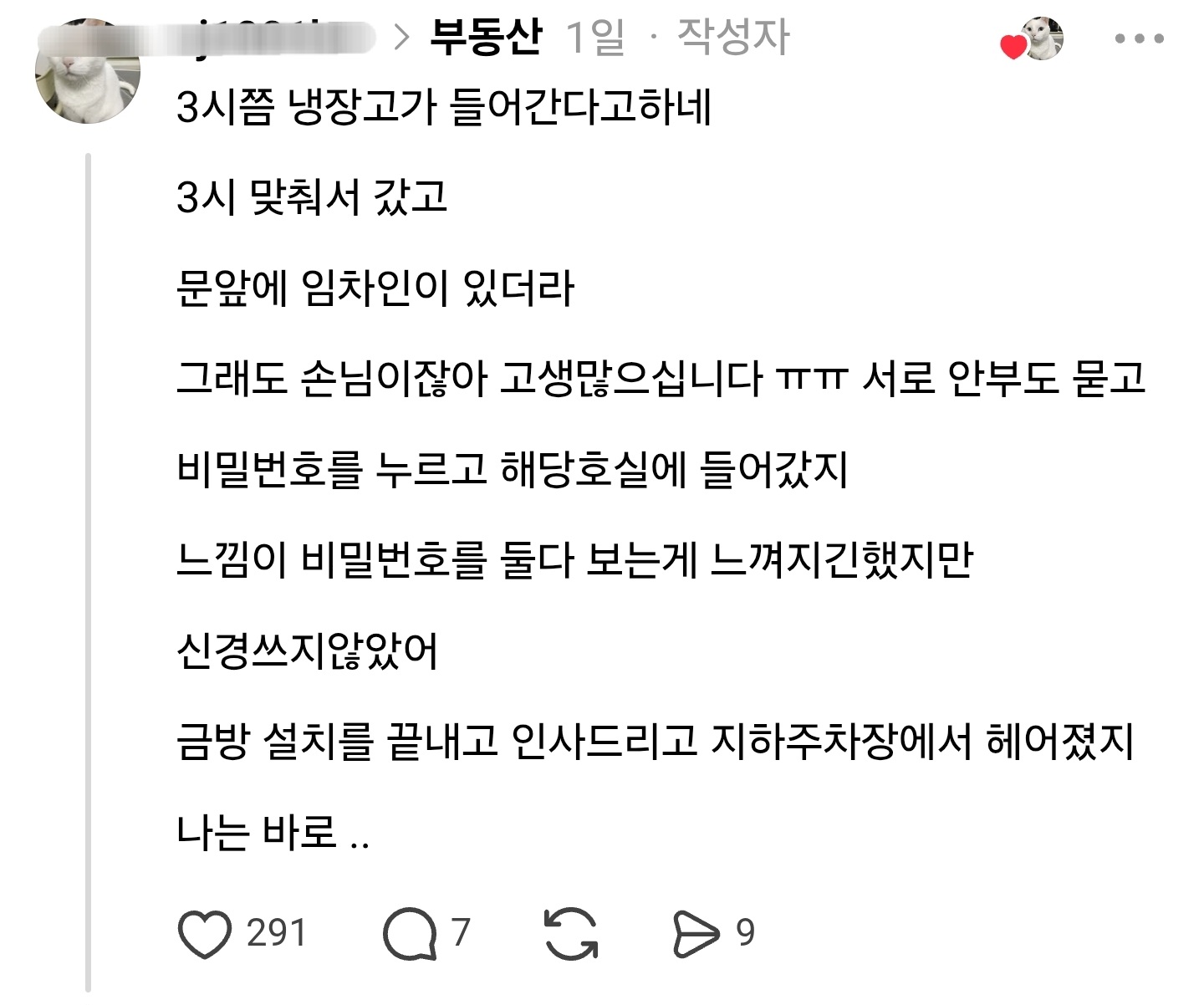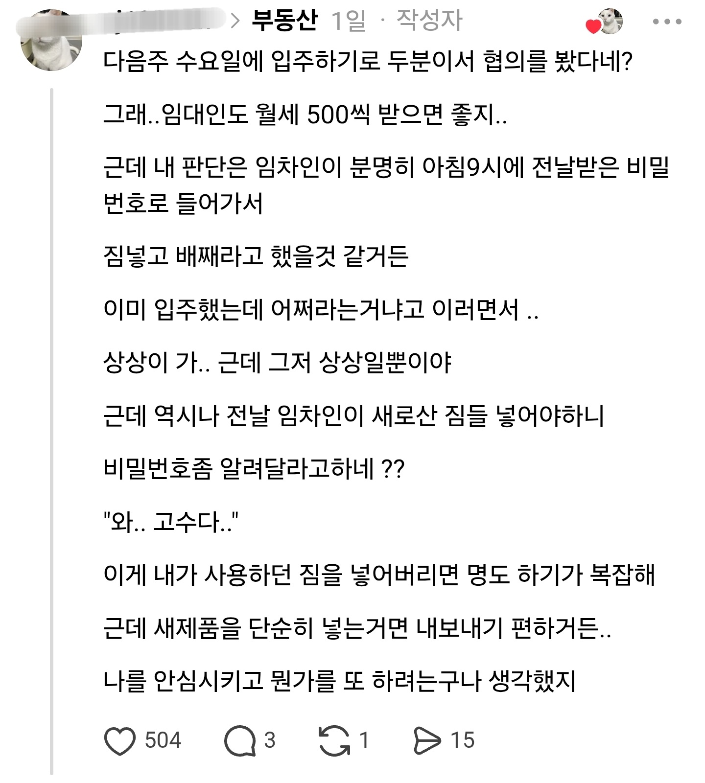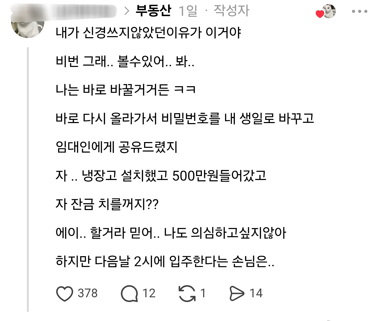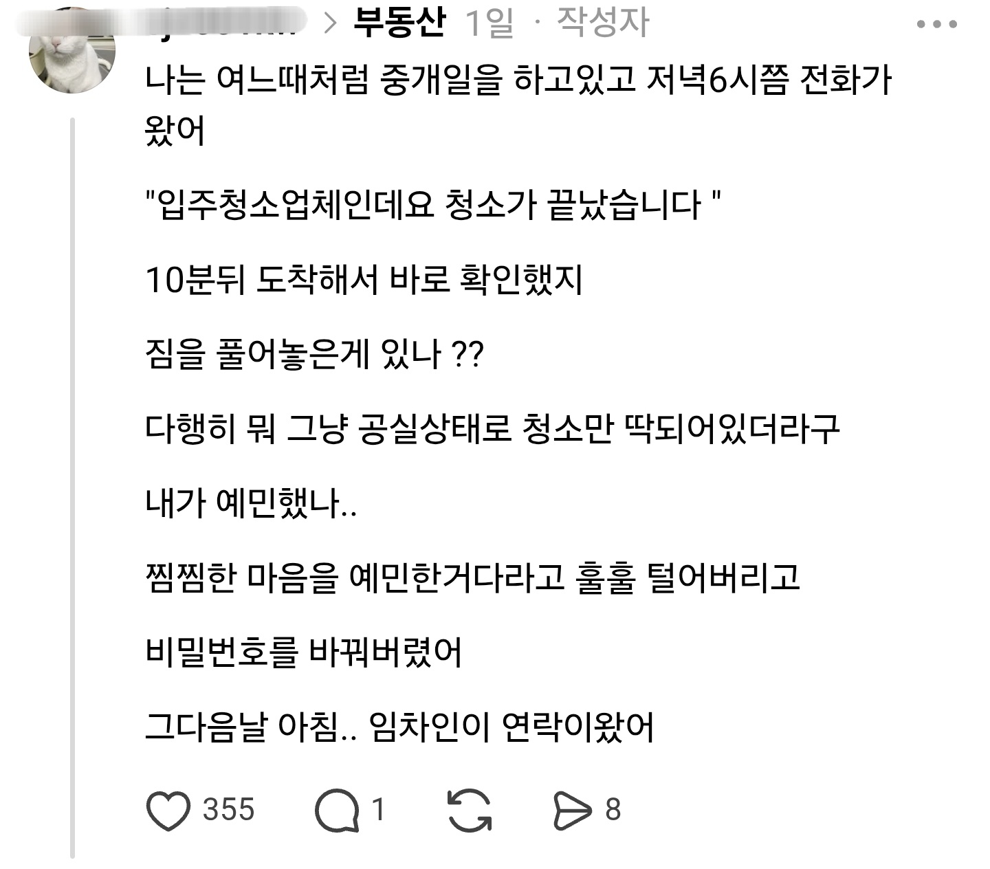 작성자이런개나리 작성시간 26.03.13 아 그래서 전날 입주청소 한다고 하면 비번 알려주는게 아니라 부동산에서 와서 문 열어주는구나.. 왜 불편하게 왔다갔다하지? 했는데 이유가 있었네