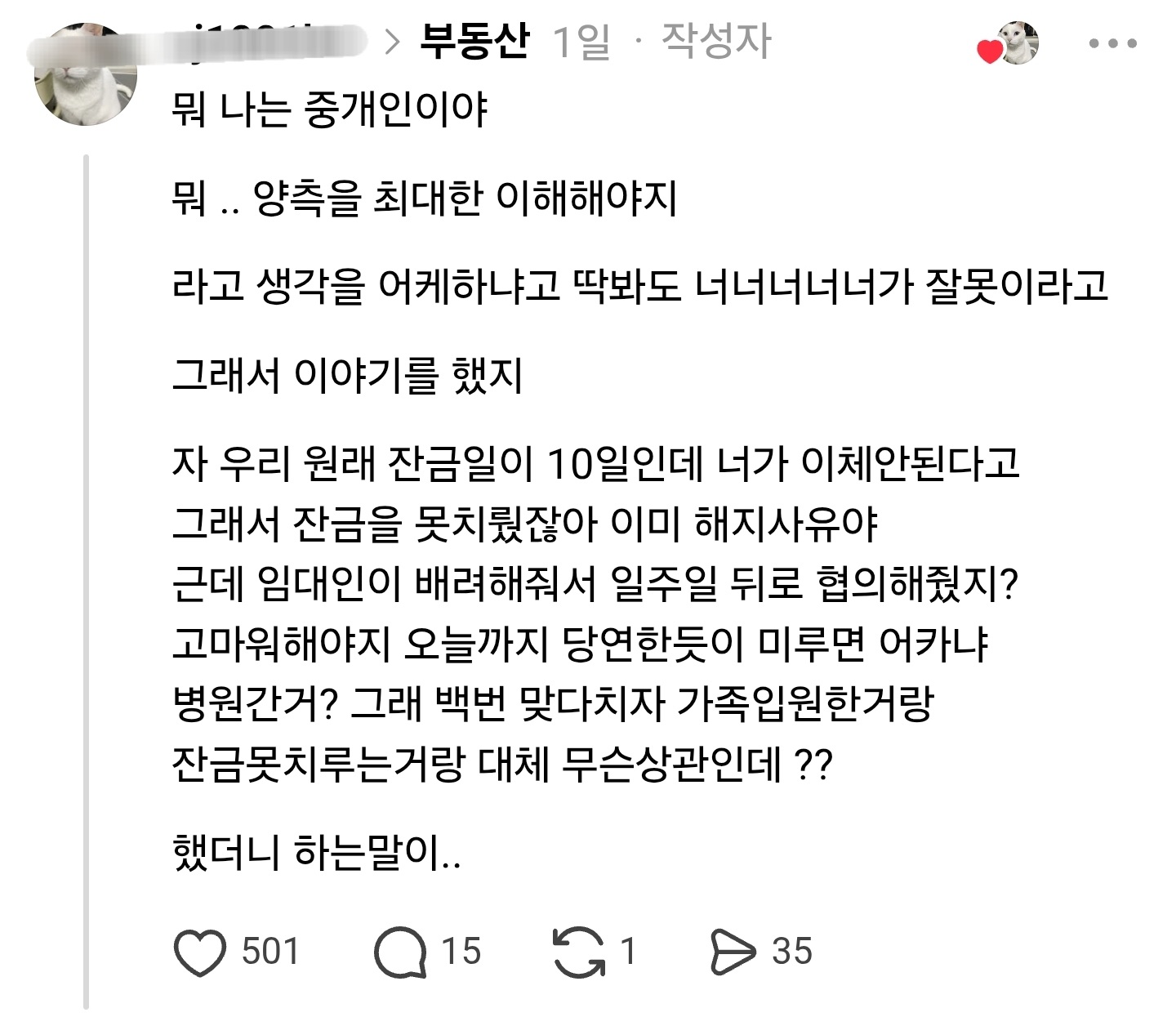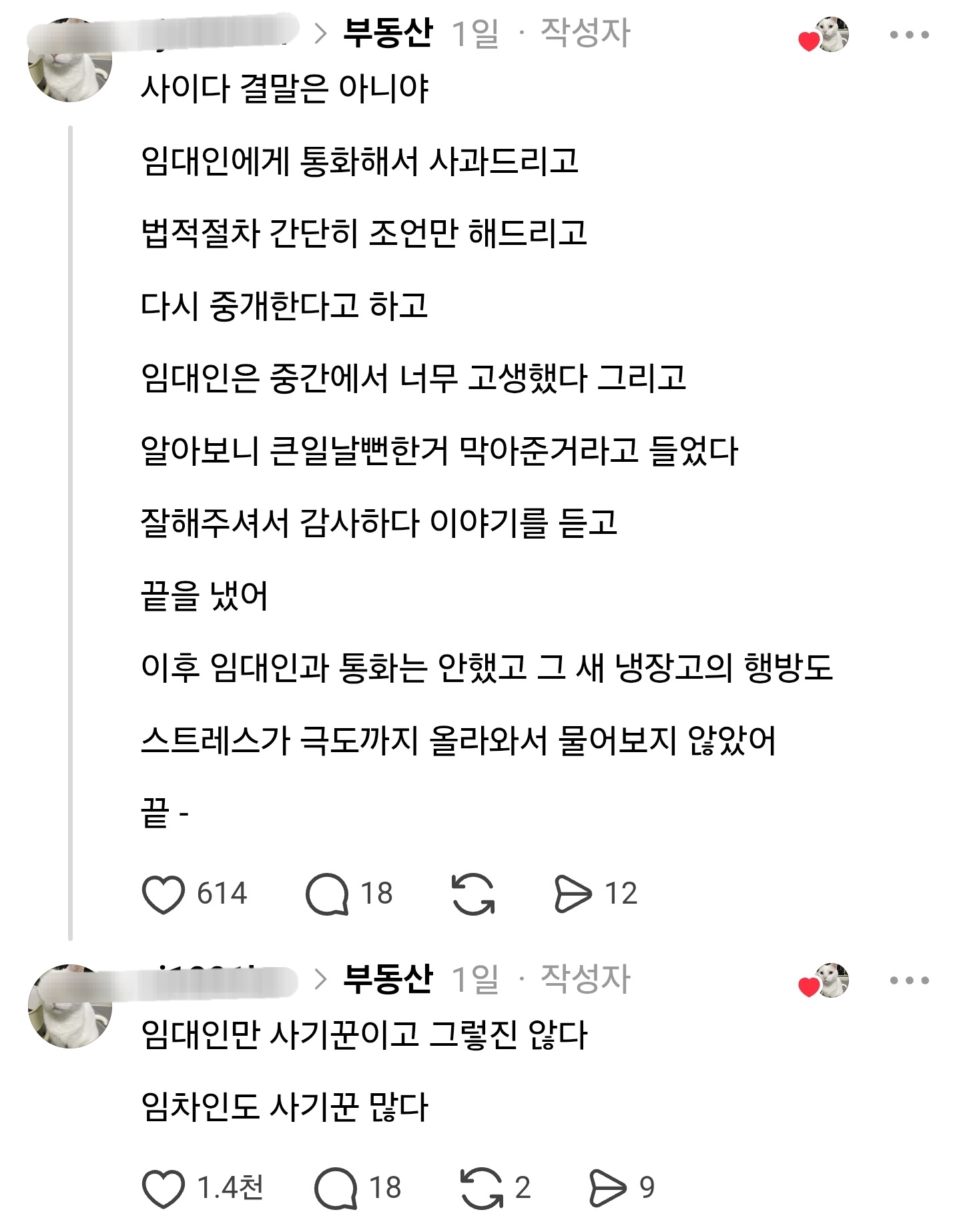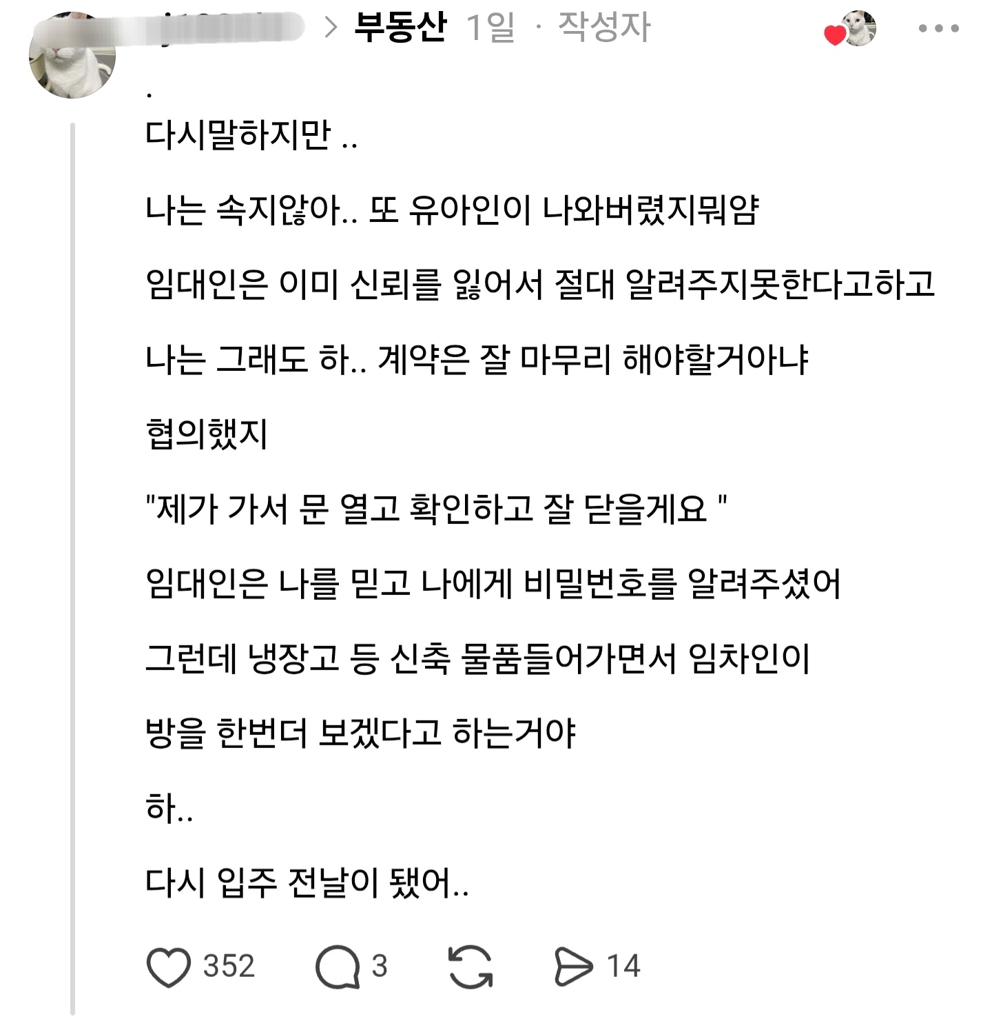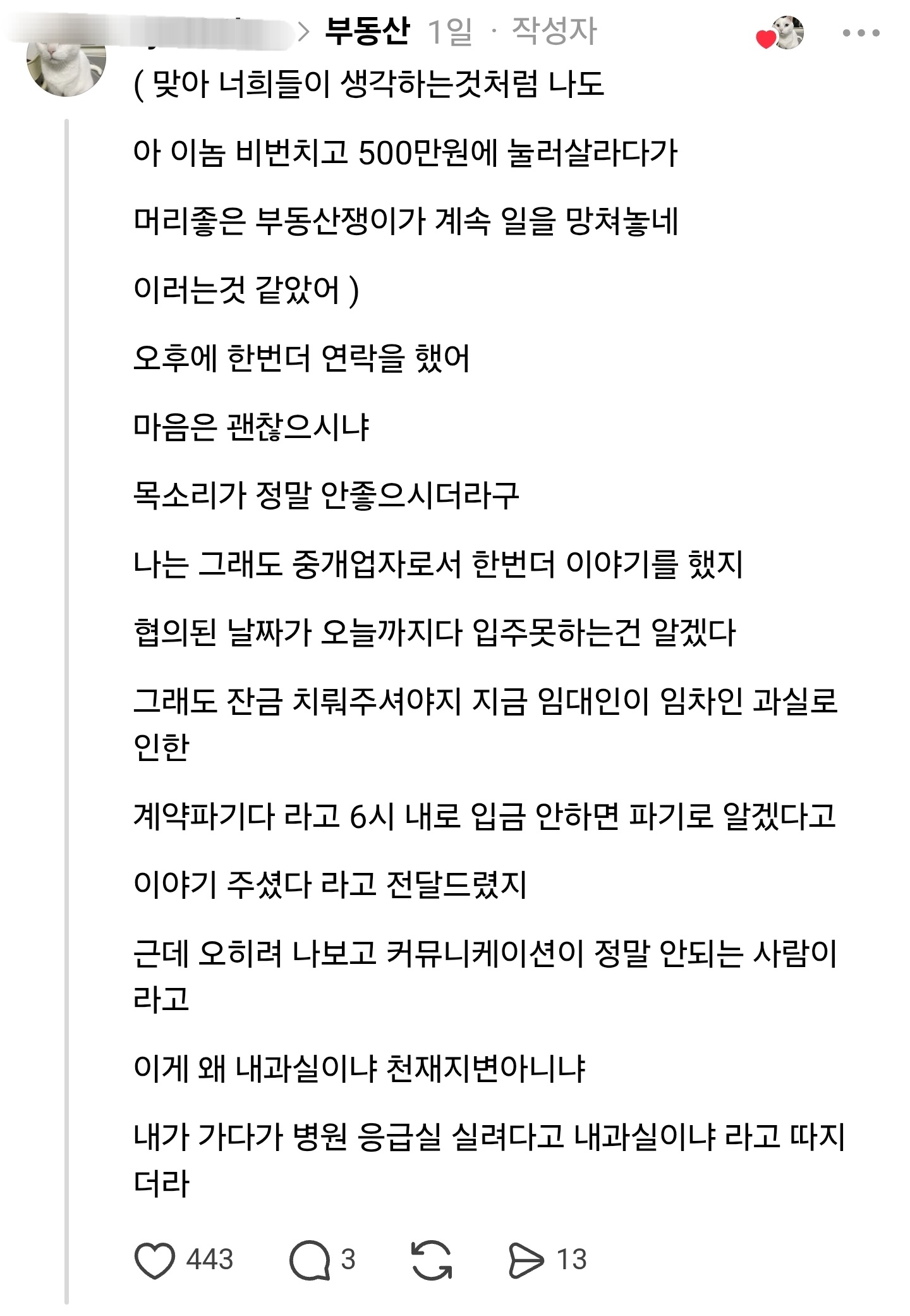 작성자빵처럼구워져지내는게아주습관 작성시간 26.03.13 못된 사람들 너무 많더라 나 몸고생 맘고생시킨 건물주, 관리인이랑 짜고친 부동산중개자새키 벌받아라