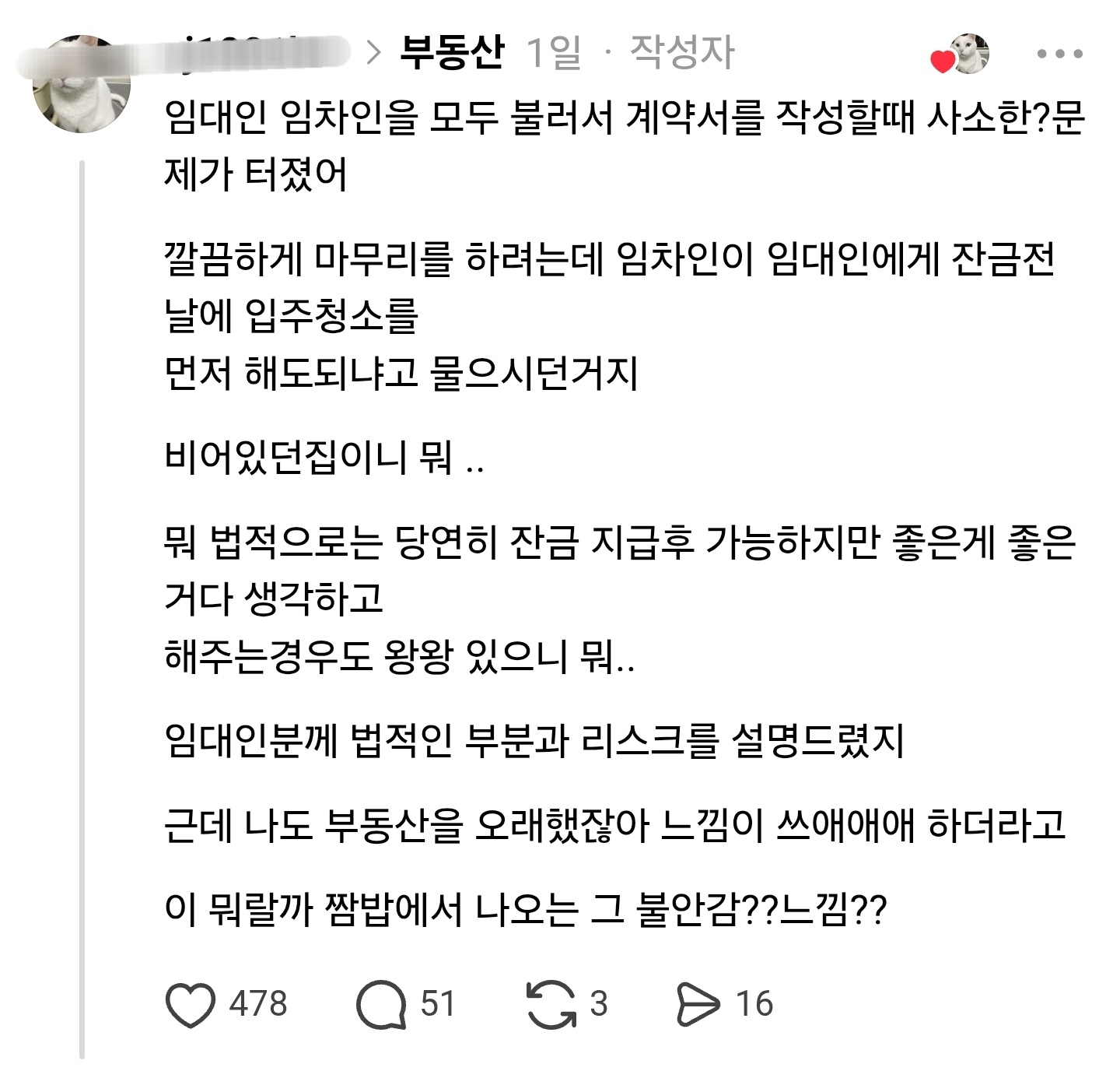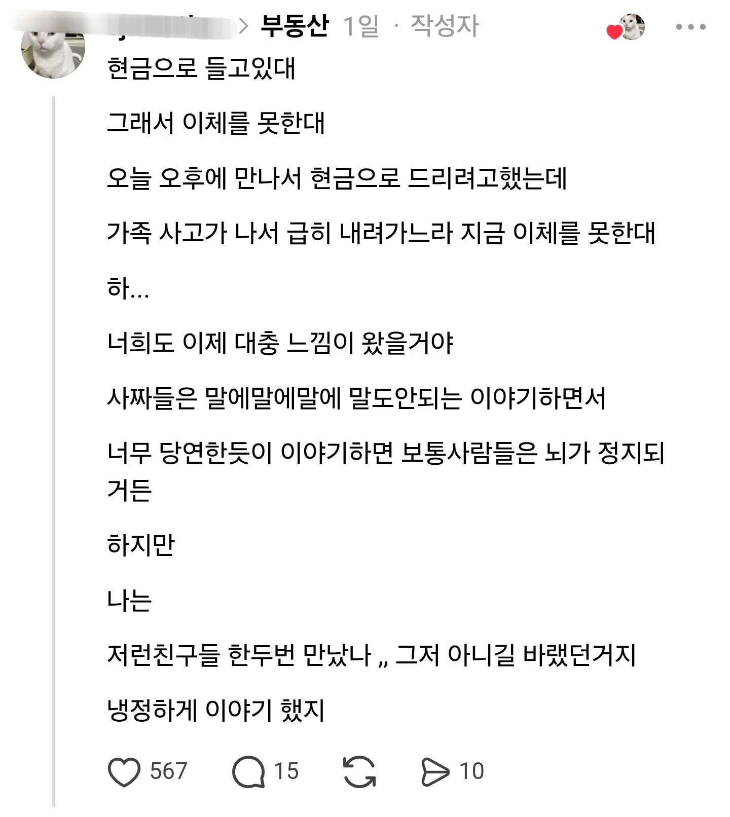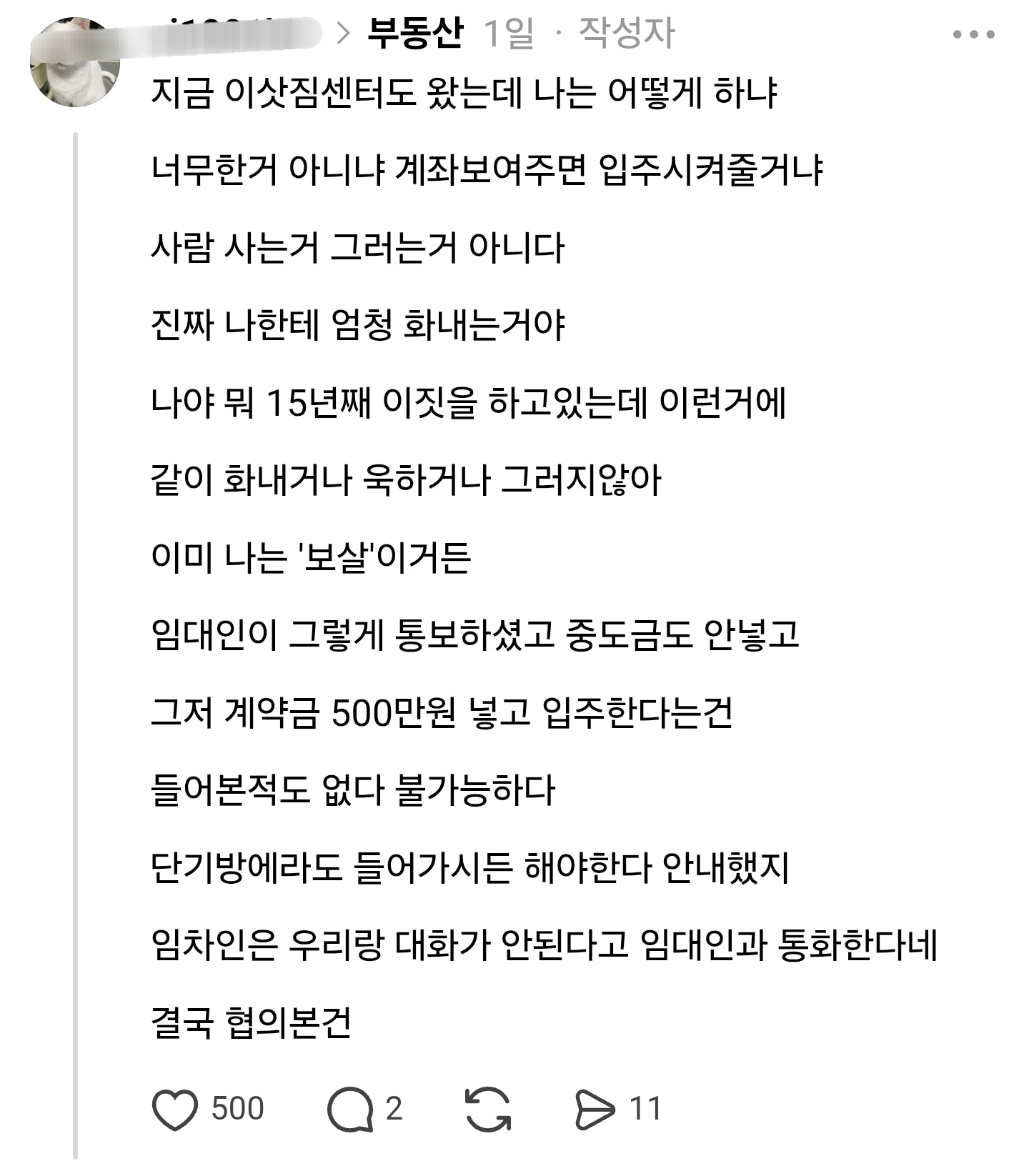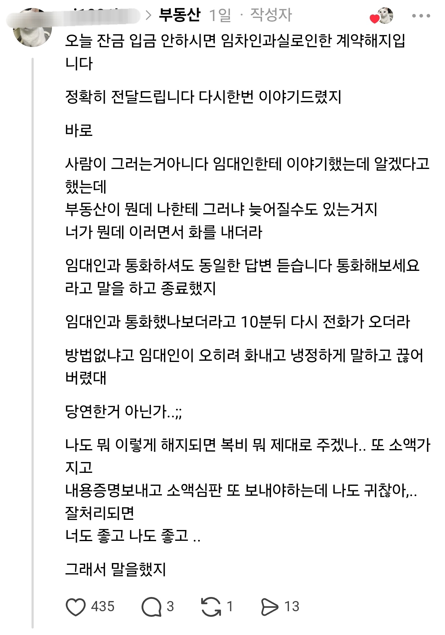 작성자빵처럼구워져지내는게아주습관 작성시간 26.03.13 못된 사람들 너무 많더라 나 몸고생 맘고생시킨 건물주, 관리인이랑 짜고친 부동산중개자새키 벌받아라