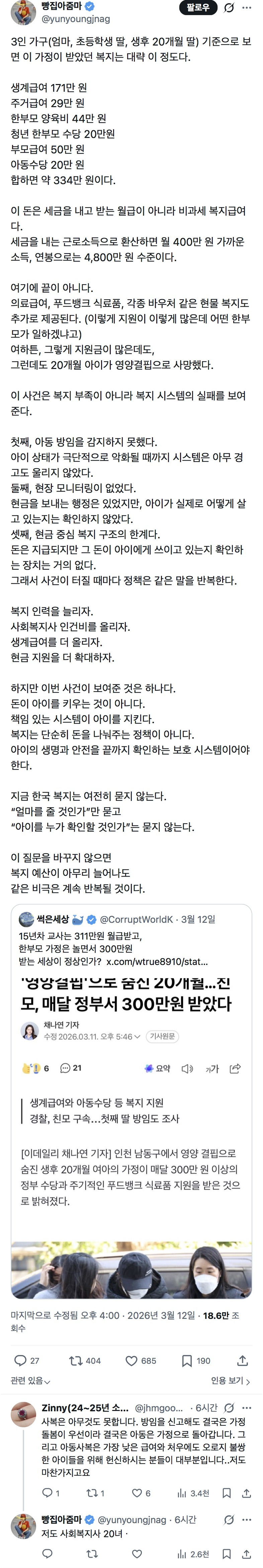 작성자천상연 미친 정신병자야 널 사랑해 작성시간 26.03.19 근데 저게 왜 복지 금액이 너무 높다 로 귀결되는거지,,,,? 복지가 과하다로 결론을 낼 문제가 아니라 복지가 보호하지 못한 부분에 대해 논의를 해야지