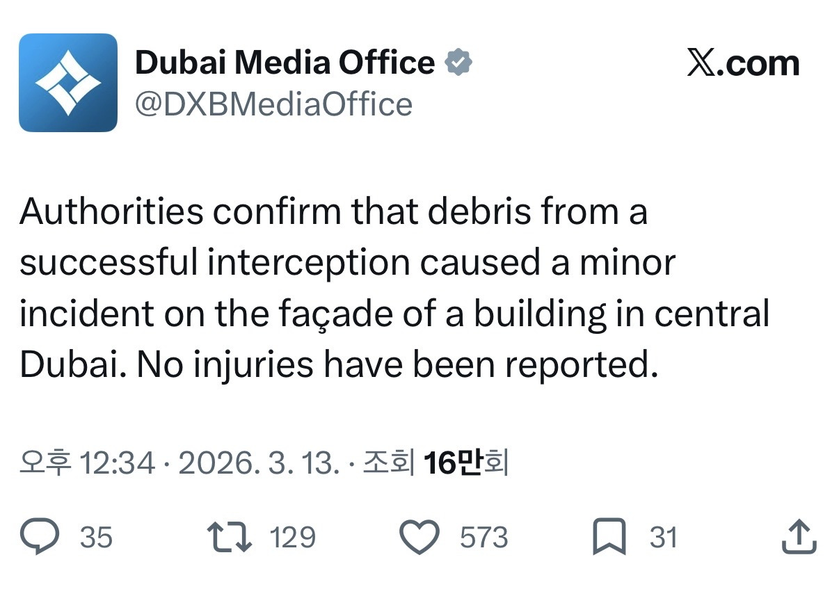 [여시뉴스데스크][속보] 두바이 국제금융센터 피격 작성자두부당|작성시간26.03.13|조회수68,671 목록 댓글 177 글자크기 작게가 글자크기 크게가 출처: https://theqoo.net/square/4124965045https://youtu.be/__iTkUs3OBw이란 드론 소행이라고 함 헐.... +추가))이란 드론을 요격하다가 파편이 빌딩으로 떨어진거래 다음검색 현재 게시글 추가 기능 열기 북마크 공유하기 신고 센터로 신고 댓글 댓글 177 댓글쓰기 답글쓰기 댓글 리스트 작성자러브윈즈올 | 작성시간 26.03.14 헐 작성자핫크리스피 황금올리브 닭다리로 | 작성시간 26.03.14 두바이진짜 존나 짜ㅡ증나겟다 중간에서... 답댓글 작성자핫크리스피 황금올리브 닭다리로 | 작성시간 26.03.14 근데또 이런 여론이 형성돼서 나중에 더잘될듯..? 작성자패로니 | 작성시간 26.03.14 미국사는데 저 영상 미국에서는 금지라고 재생안되네 ;; 뭐지 작성자진달래대피소 | 작성시간 26.03.14 헐 댓글 전체보기