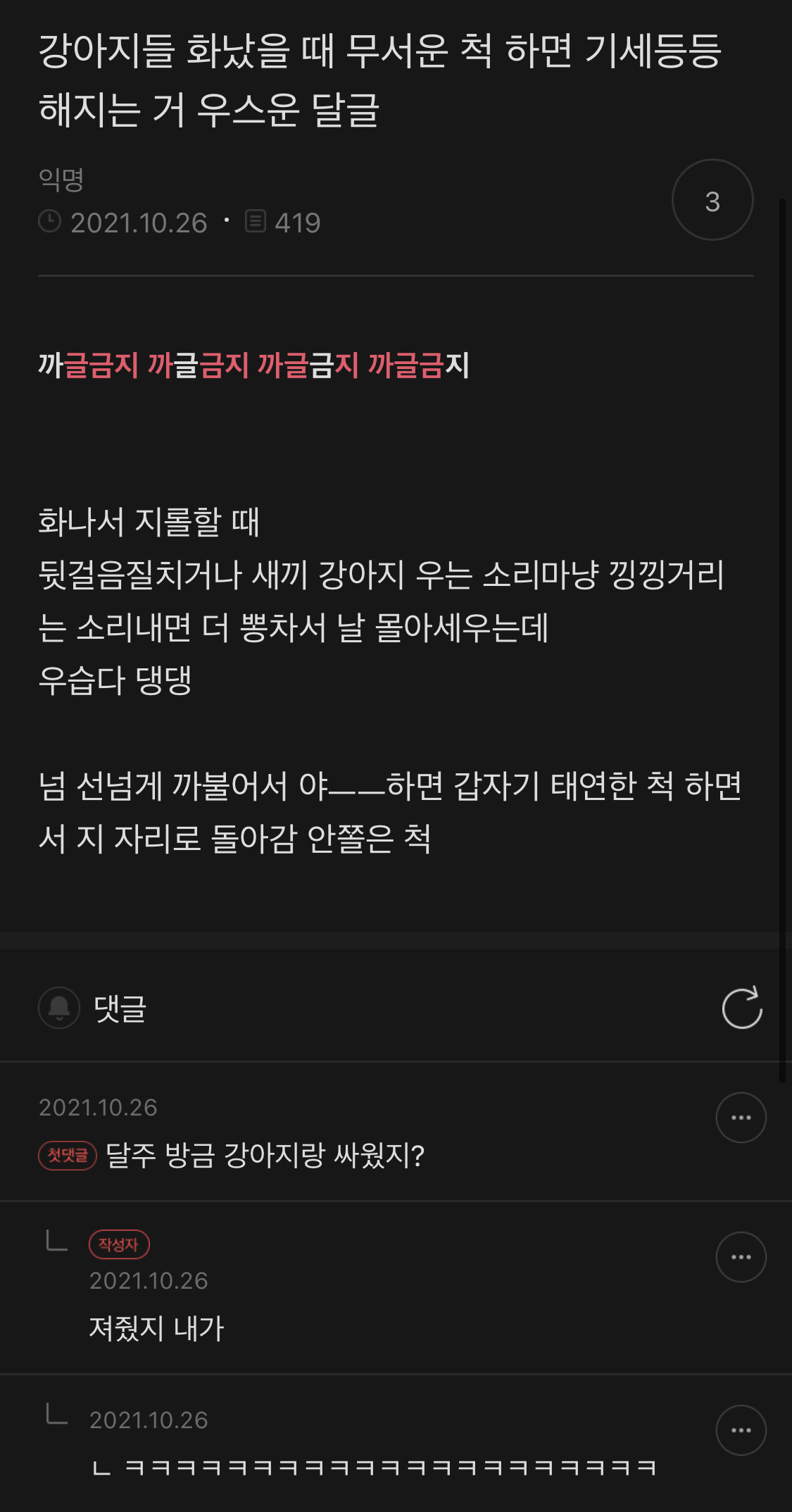 [배꼽의행방]강아지들 화났을 때 무서운 척 하면 기세등등해지는 거 우스운 달글 작성자미쳤어...|작성시간26.03.13|조회수47,858 목록 댓글 29 글자크기 작게가 글자크기 크게가 출처: 여성시대 미쳤어...“져줬지 내가” 다음검색 현재 게시글 추가 기능 열기 북마크 공유하기 신고 센터로 신고 댓글 댓글 29 댓글쓰기 답글쓰기 댓글 리스트 작성자사이사이사이사이 | 작성시간 26.03.13 우리개는 화를 안내던데 한번만 화내봤으면좋겠다 나도해보게ㅋㅋㅋㅋㅋㅋㅋㅋ 작성자펫샵충들죽인다 | 작성시간 26.03.13 티난다고 작성자퉤퉤사 | 작성시간 26.03.13 ㅋㅋㅋ 작성자아무닉네임임 | 작성시간 26.03.13 ㅋㅋㅋㅋㅋㅋㅋㅋㅋㅋㅋㅋㅋㅋㅋㅋㅋㅋㅋㅋㅋㅋㅋ 작성자닉네임, | 작성시간 26.03.13 귀엽네 ㅋㅋㅋㅋㅋ 댓글 전체보기
