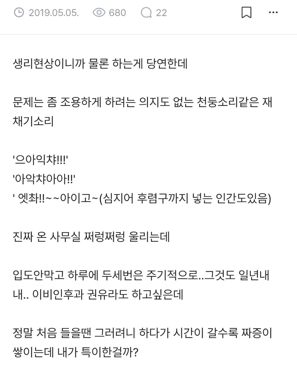 재채기는 생리현상이니까 나오는건 당연한데 최소한의 작게 하려는 노력도 없이 ㅈㄹ 크게 하는 사람들